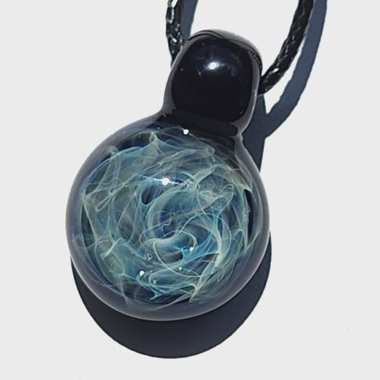 This handmade blown glass pendant features delicate swirls of pure silver fuming that shimmer in hues of blue and teal over a deep blue background. The glossy black finish frames the glowing center, giving it a rich and mysterious depth that catches the light beautifully.