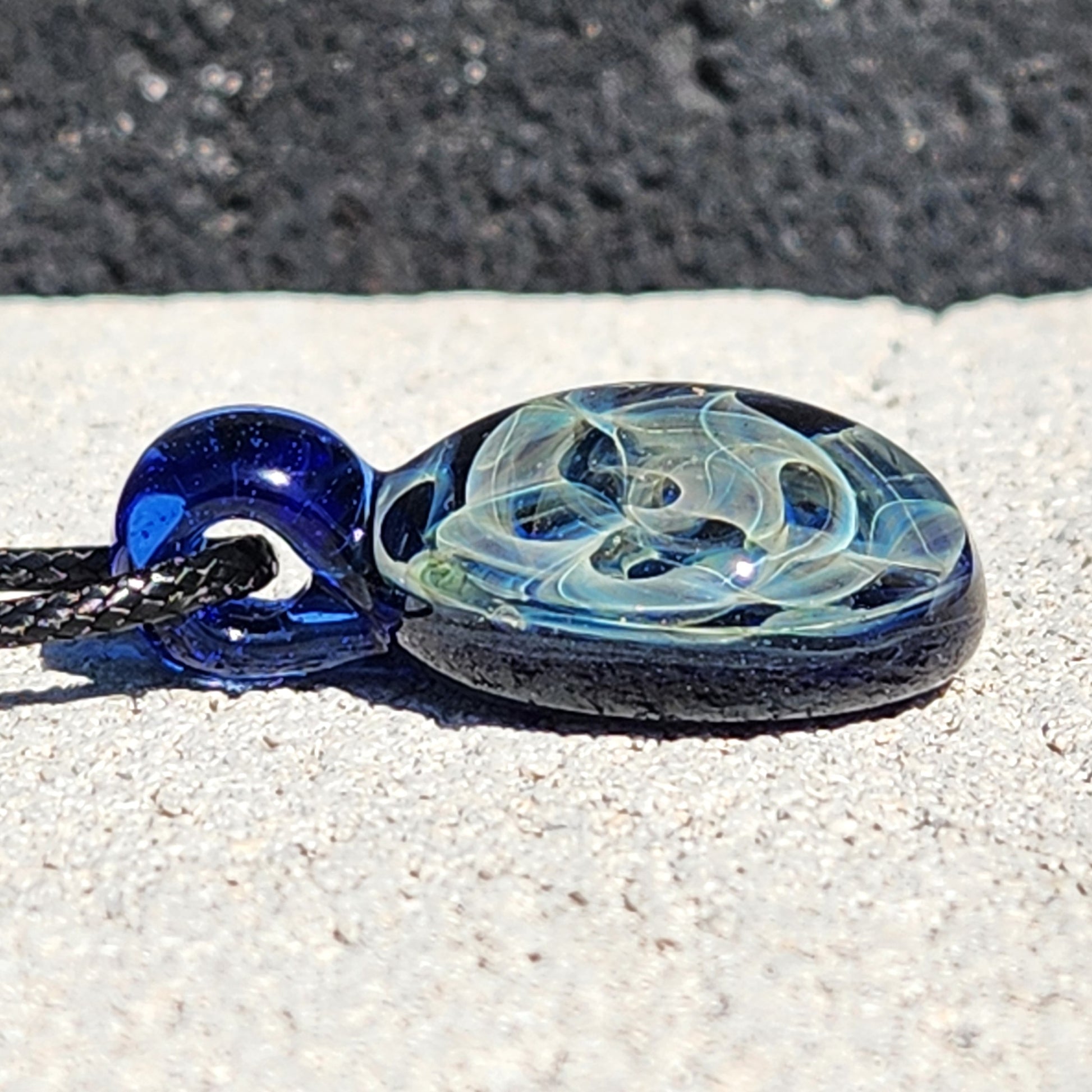 Silver fumed glass pendant necklace featuring a glowing blue borosilicate design with soft, flowing movement and depth. This handcrafted piece captures light beautifully, creating a subtle shimmer that shifts with every angle.