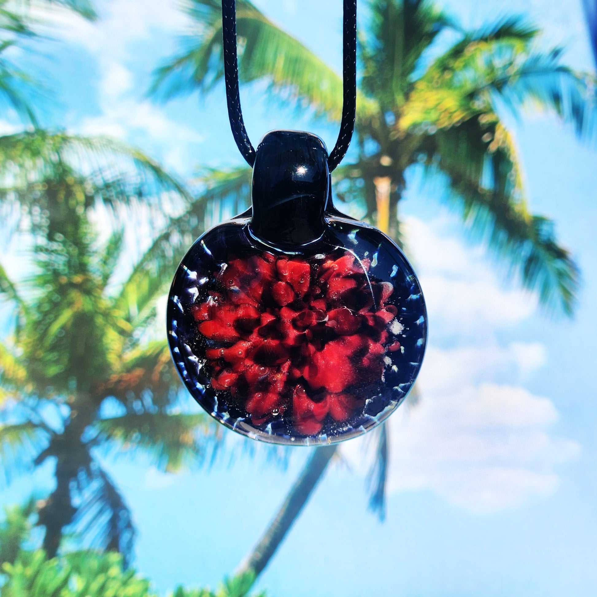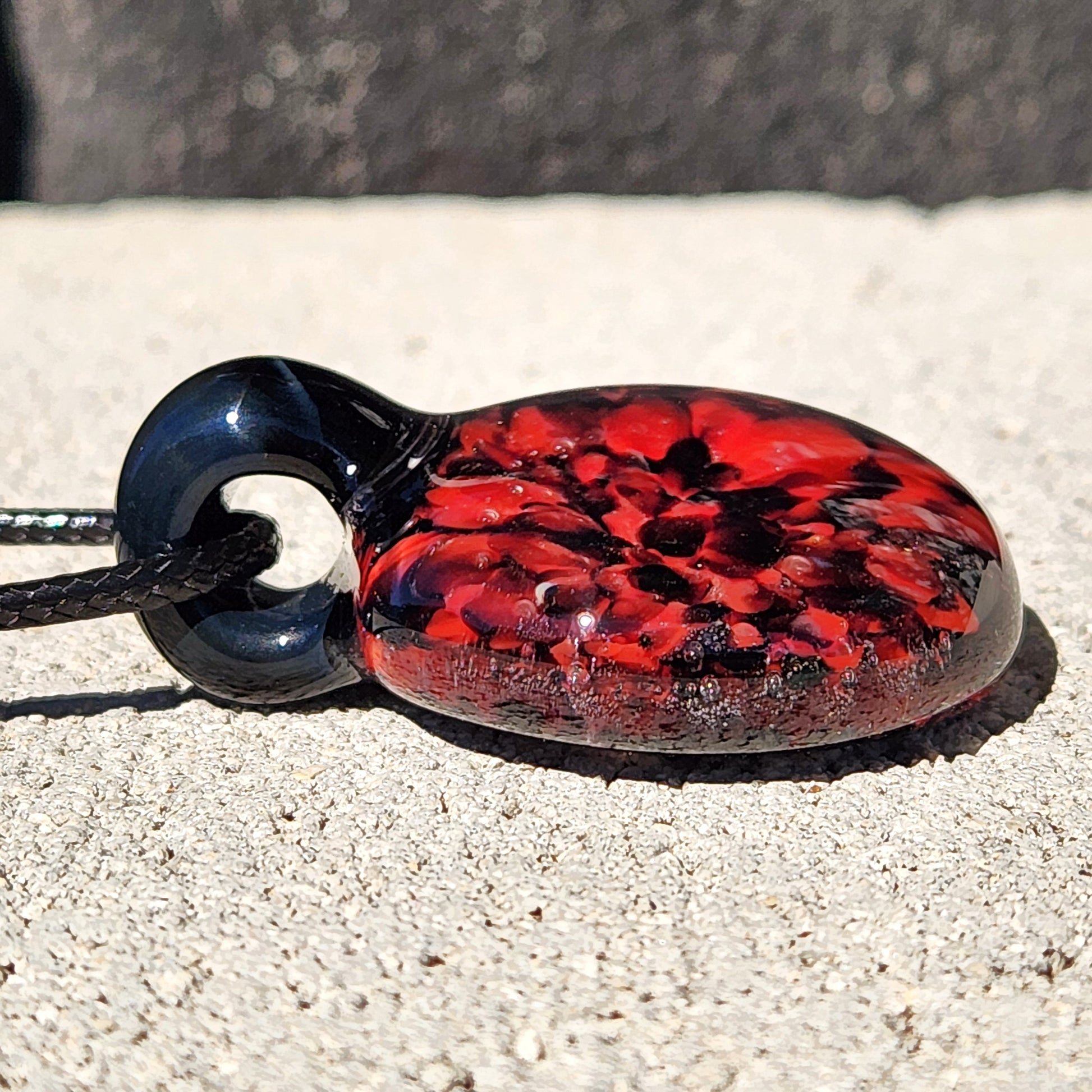 This handmade glass pendant features glowing hues of red borosilicate glass, swirling like a flame within a crystal orb. The vibrant colors shift beautifully in sunlight, revealing different tones depending on the angle. Surrounded by bold black crushed glass, this piece offers contrast and elegance in a dramatic yet wearable design.