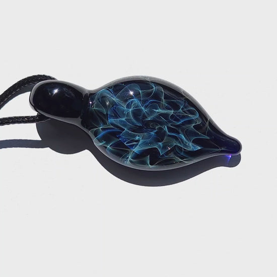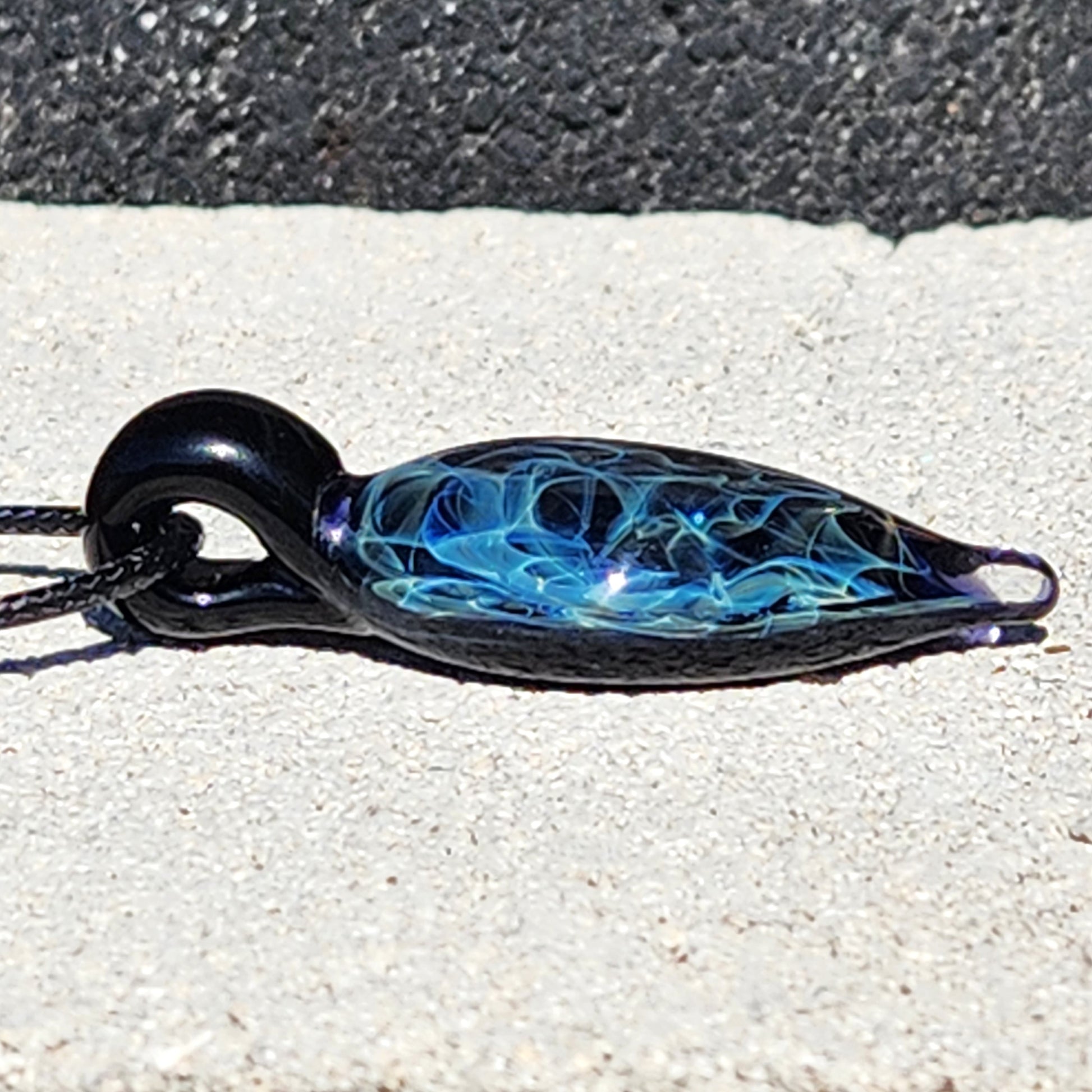 This handmade glass pendant features an elongated, flame-like form that sets it apart from classic designs. Its deep midnight blue background is illuminated with pure silver fuming, creating glowing, ethereal patterns that shift in the light. Finished in sleek black, this pendant has an elegant yet mysterious presence.