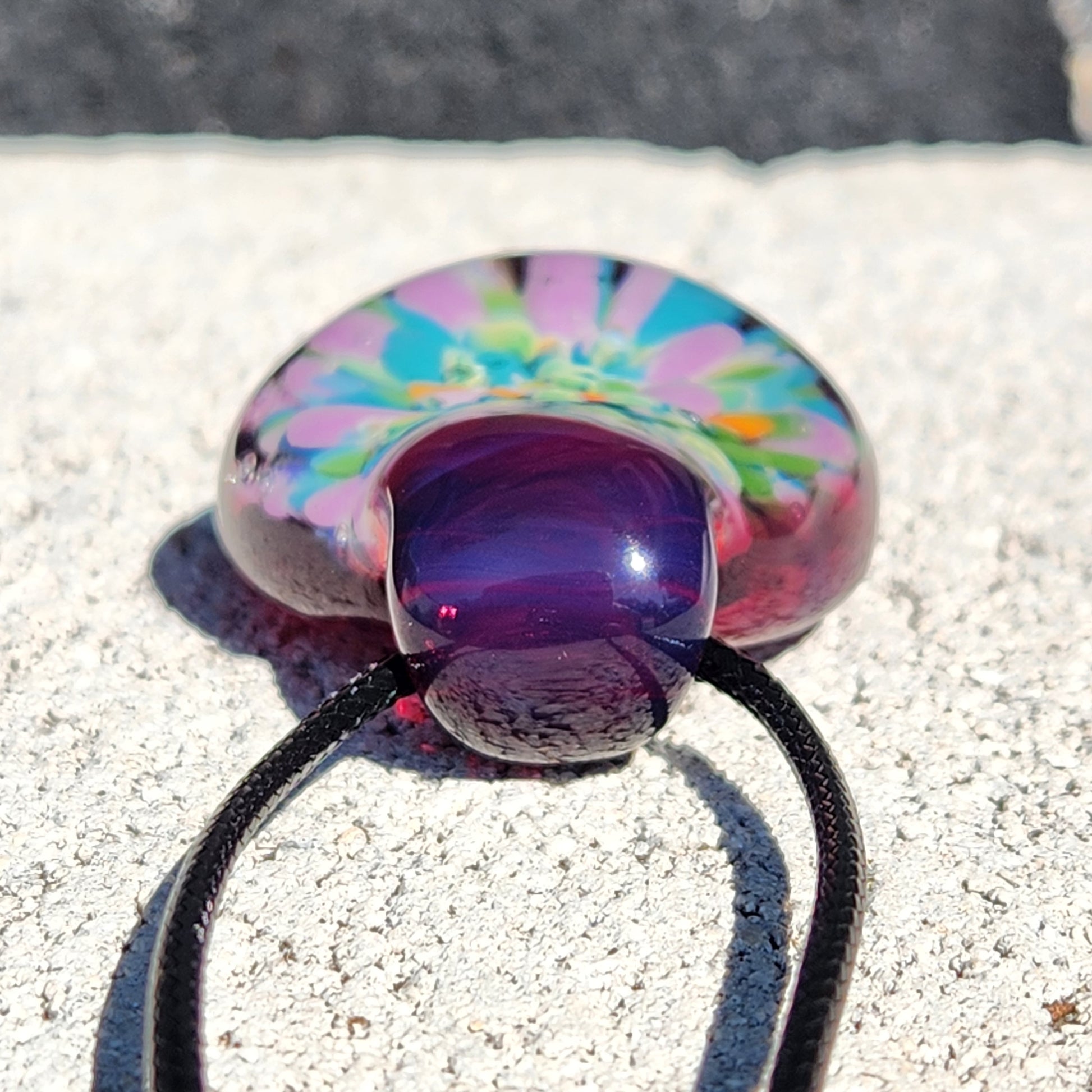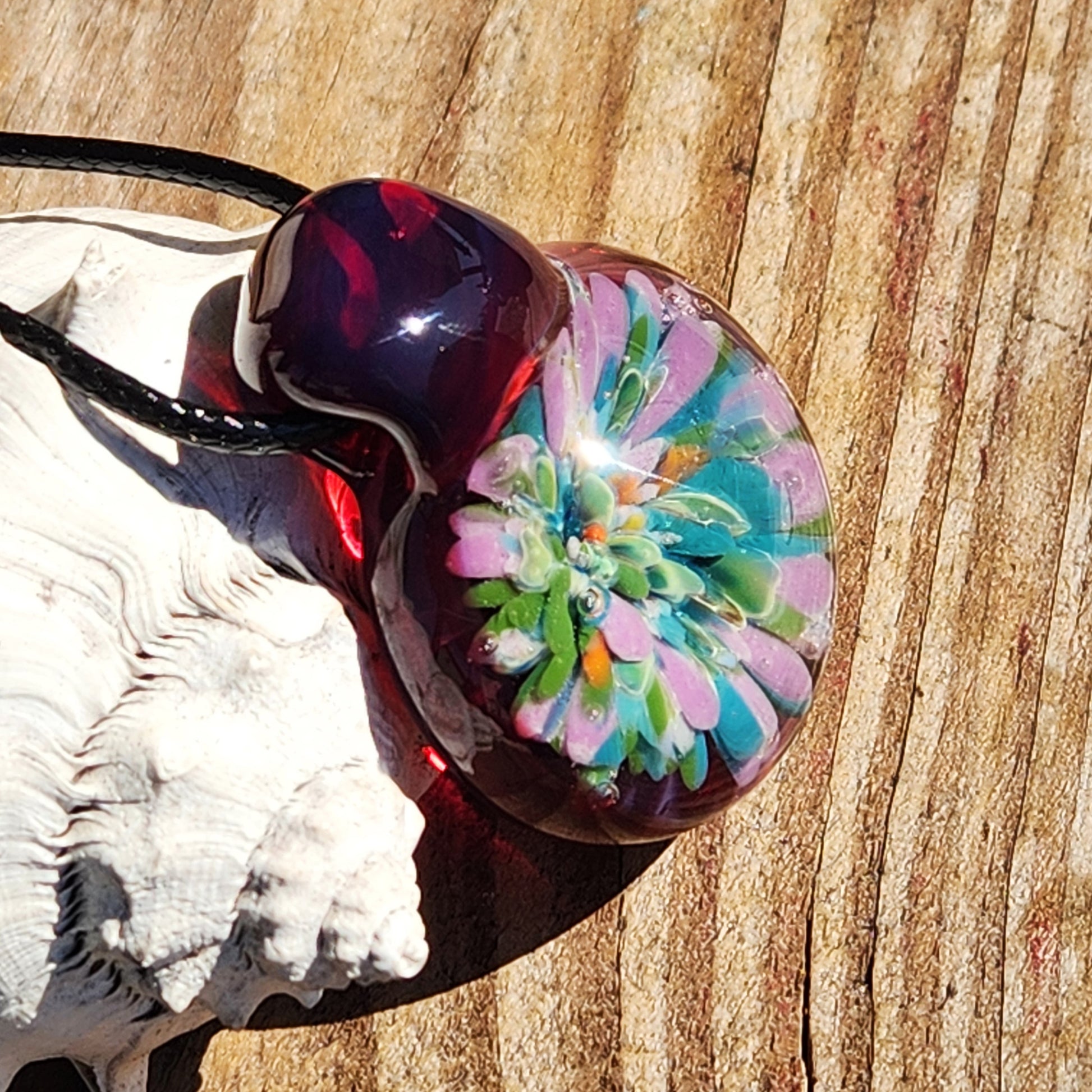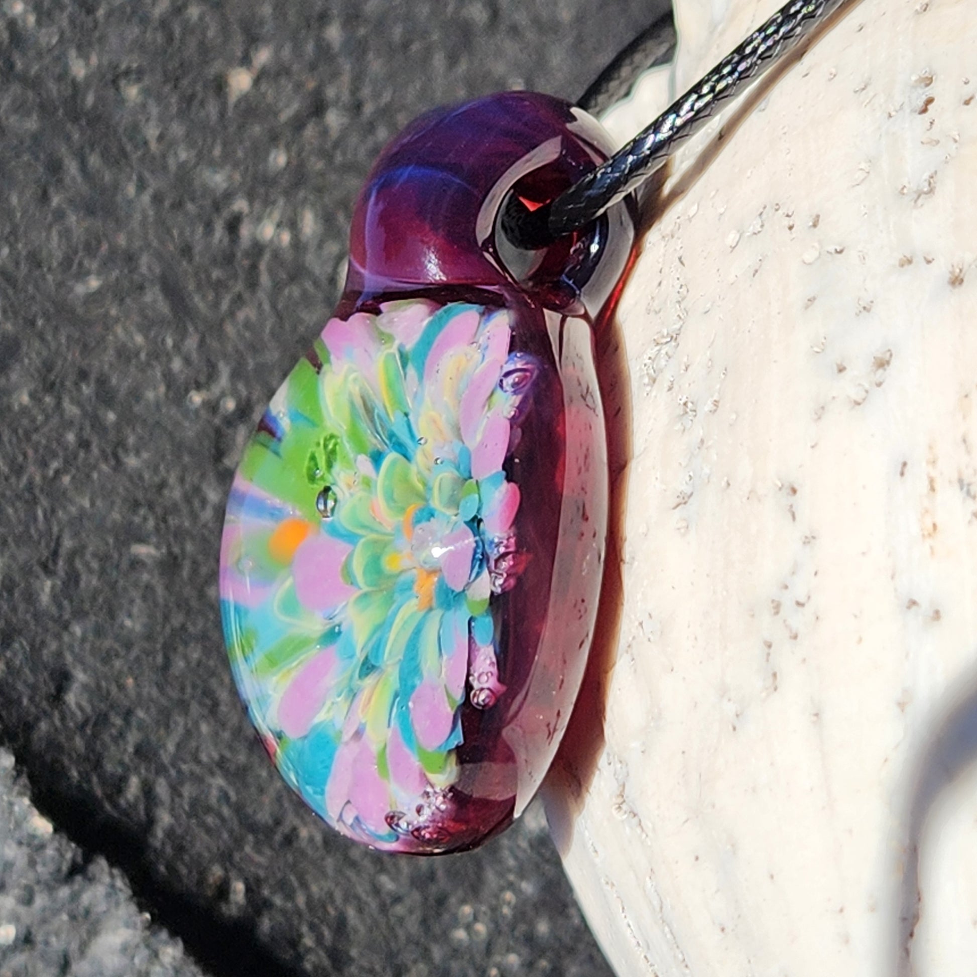 This borosilicate glass pendant necklace features a soft starburst design set on a deep purple and burgundy background.