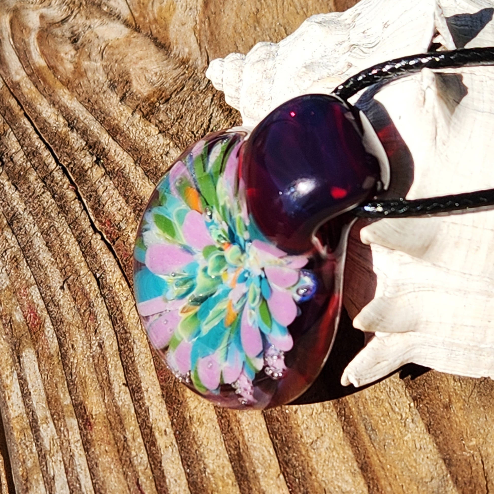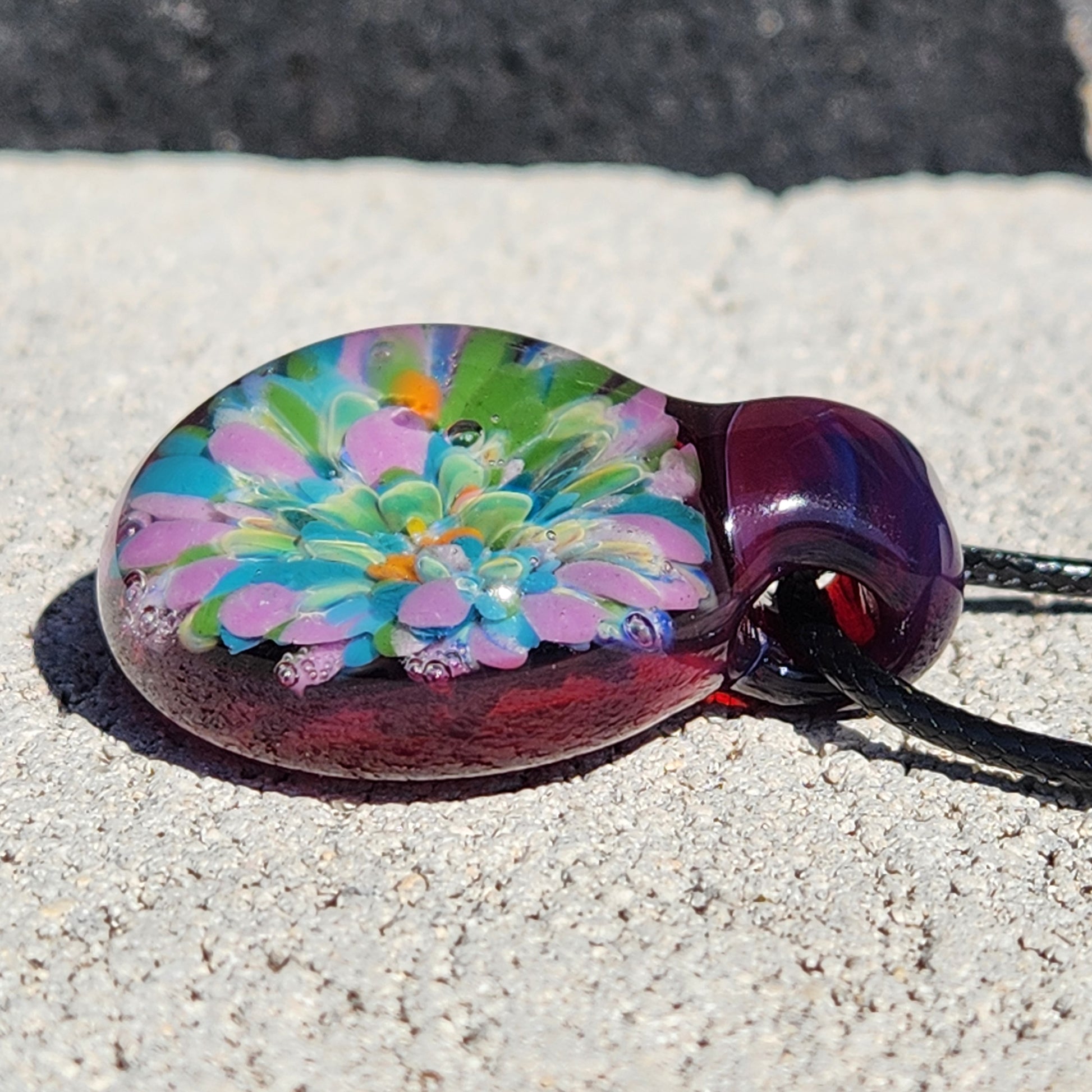 This handmade glass pendant necklace is ideal for those who love colorful art glass, boho jewelry, and unique statement designs.