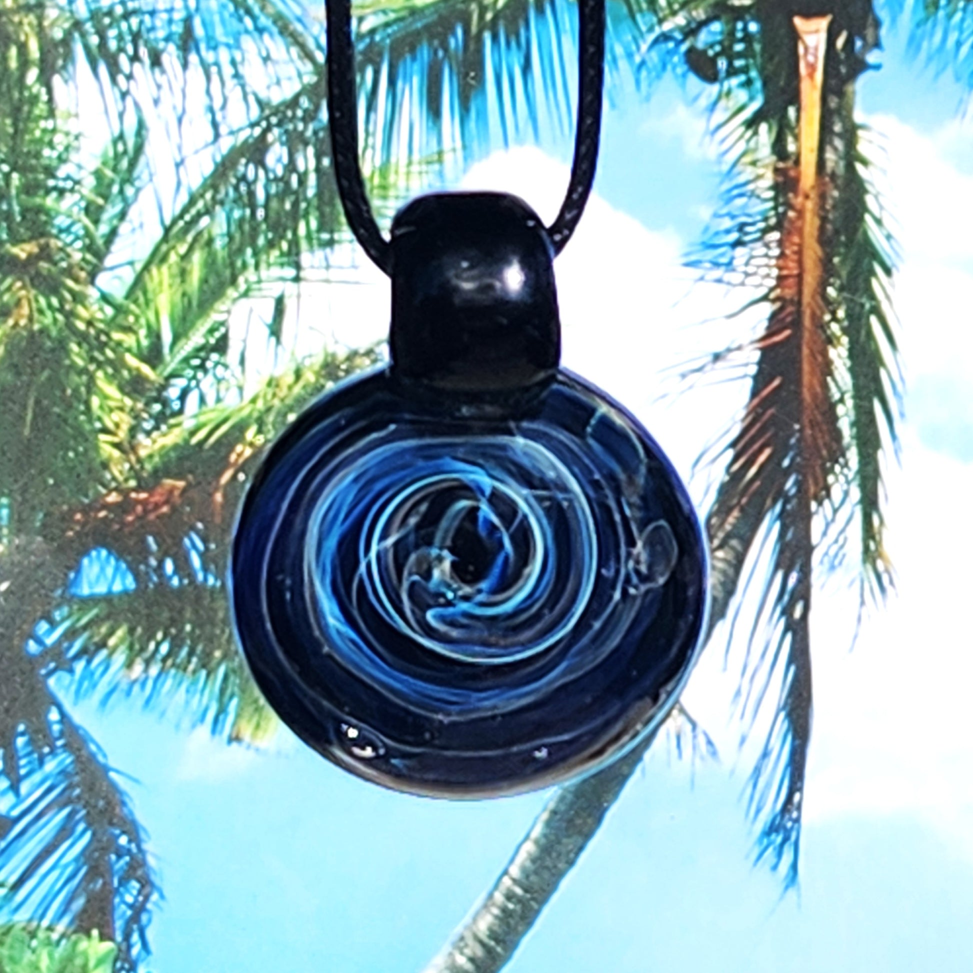 This handmade glass pendant necklace glows with swirling shades of blue, created by the magical pure silver fuming. The deep, glossy black background makes the colors pop, giving it a mesmerizing, cosmic-inspired look.