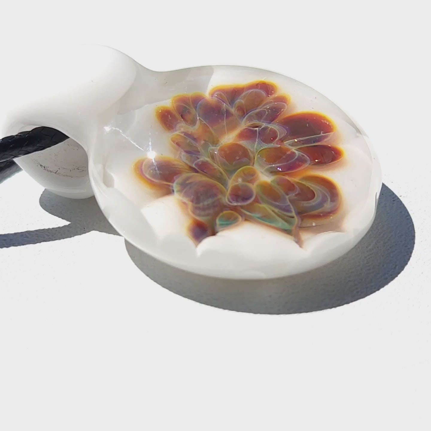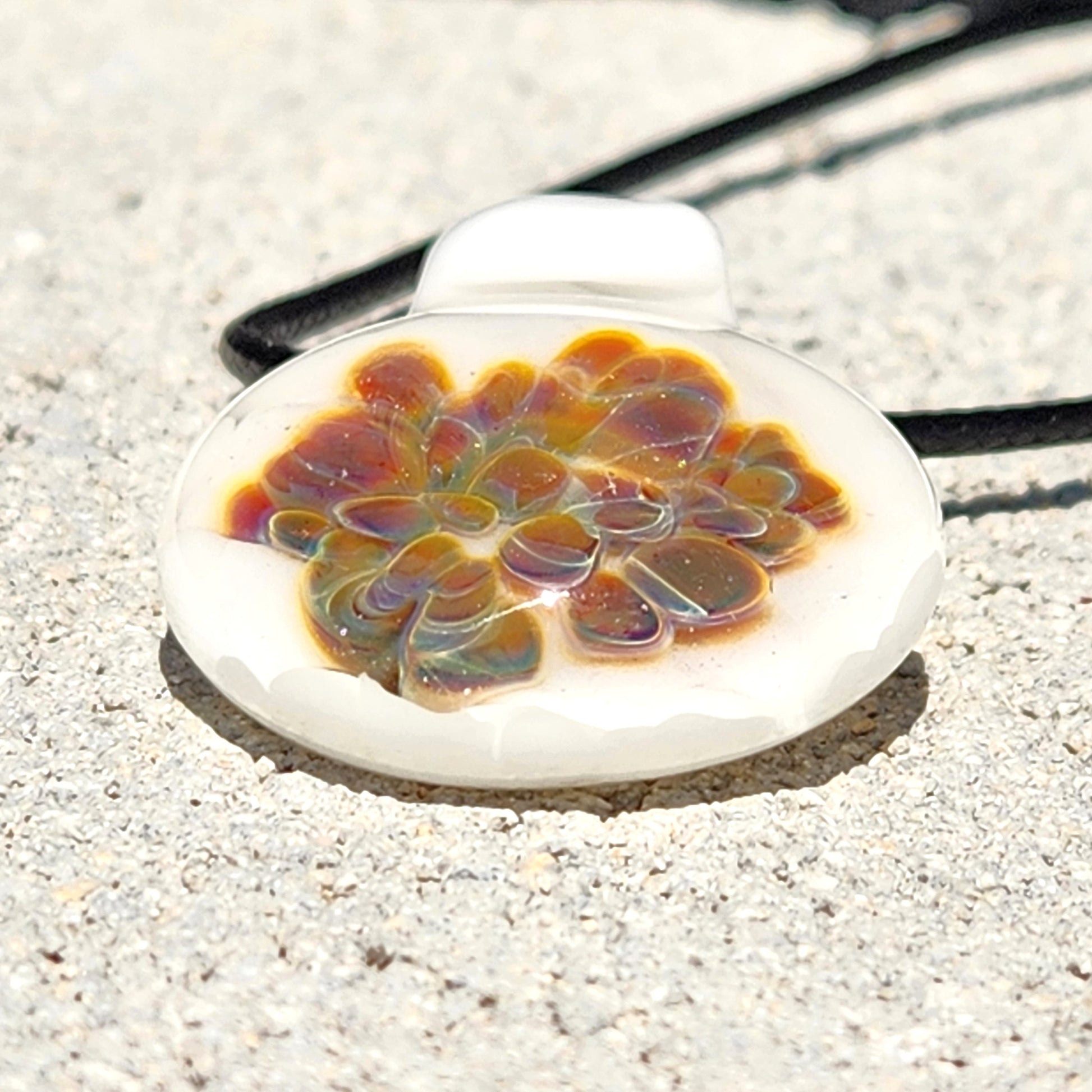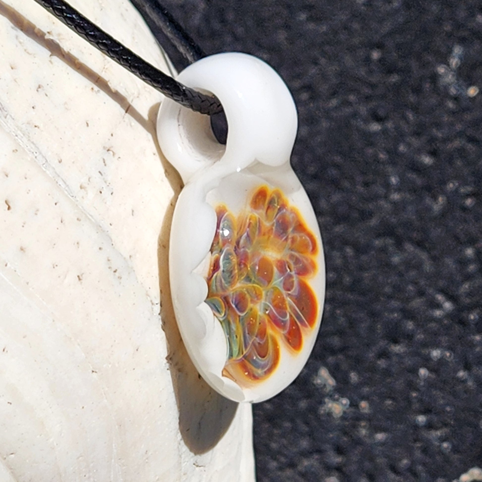 This handmade glass pendant features a glowing design in warm honey and golden-red tones, beautifully contrasted against a crisp white background. Crafted with care in the flame, each pendant is a one-of-a-kind piece of blown glass jewelry that carries a unique warmth and character.