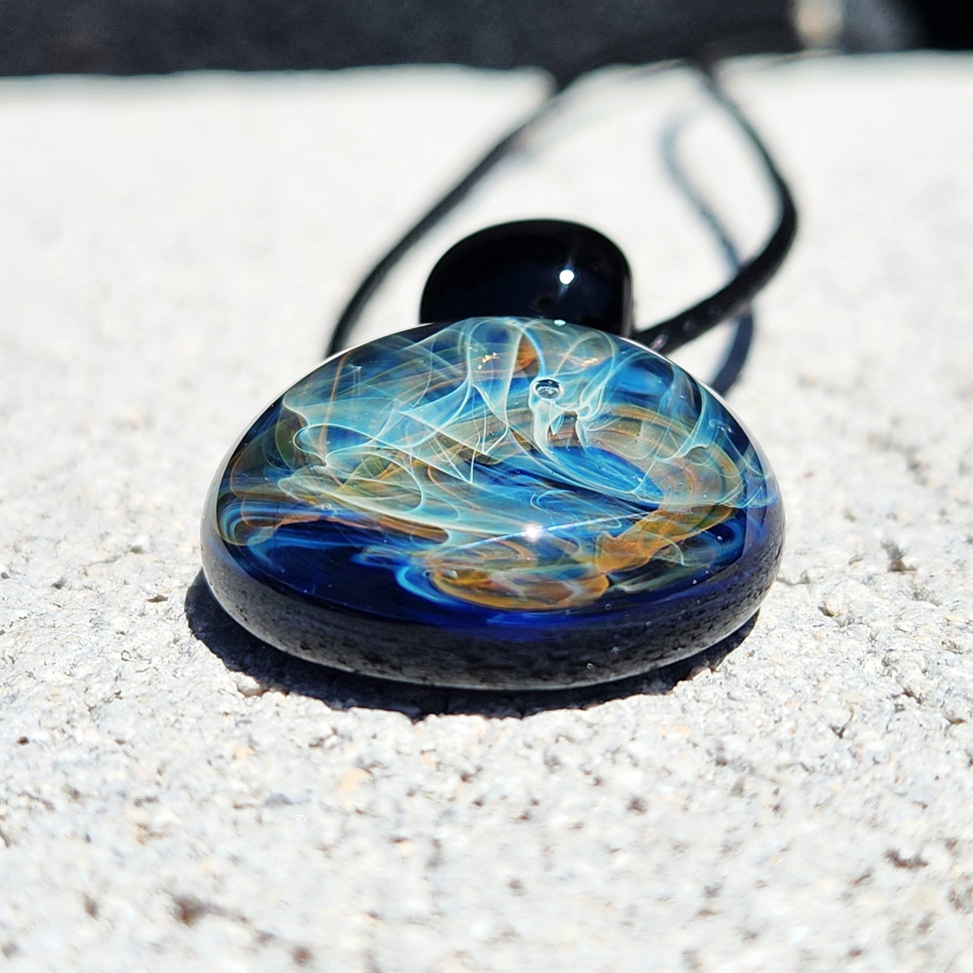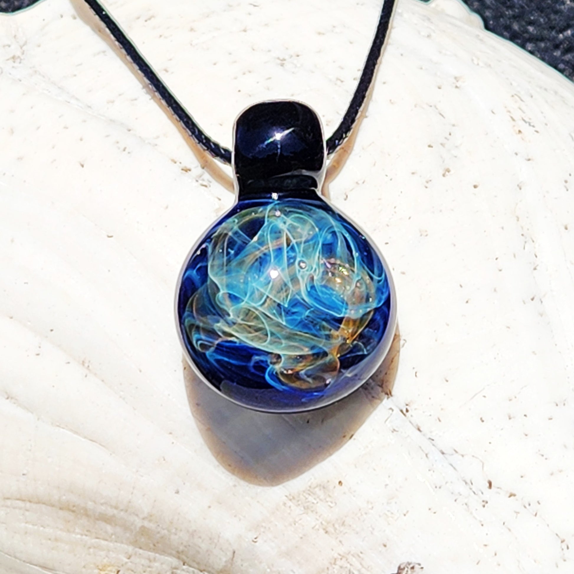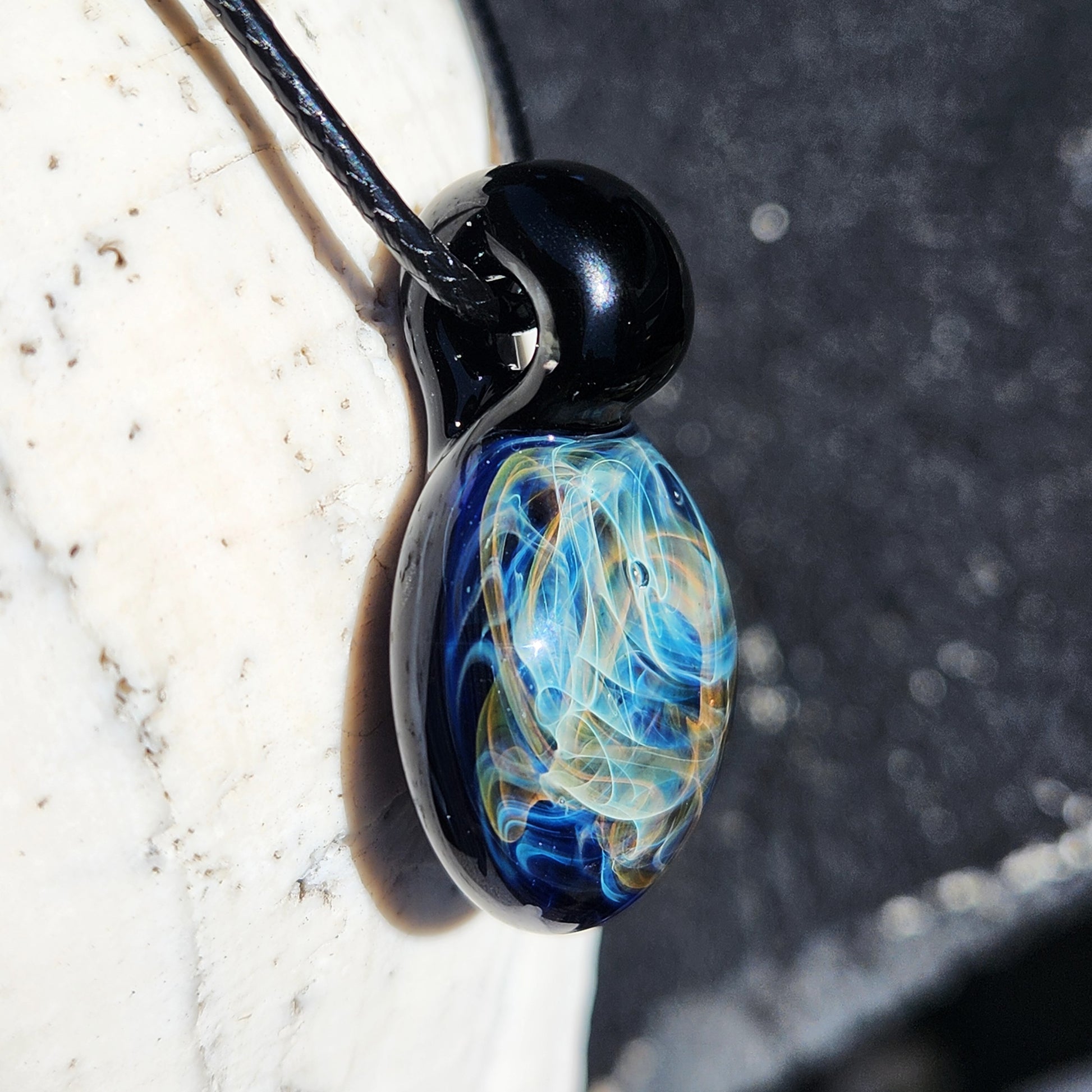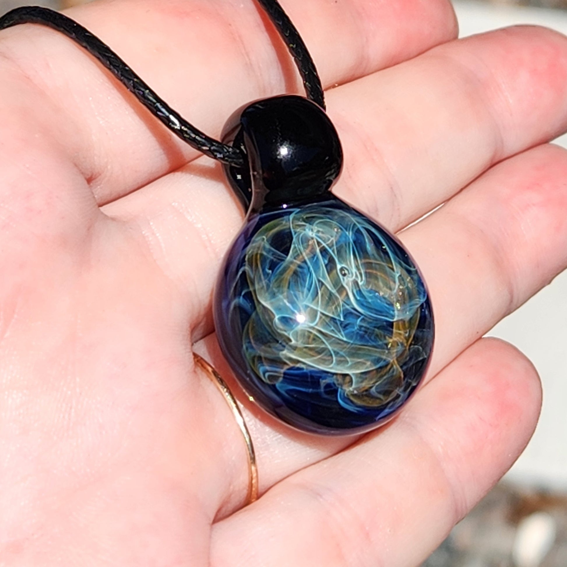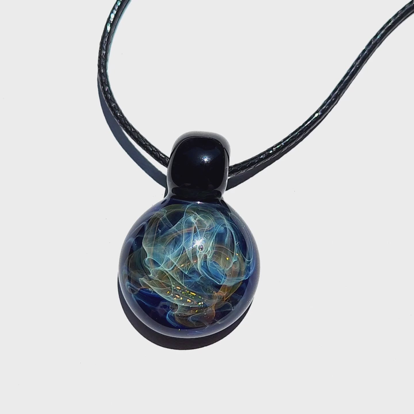 Every pendant is crafted from borosilicate glass, known for its strength and durability. The pendant pictured here is the exact one you will receive, completely unique and impossible to duplicate.
