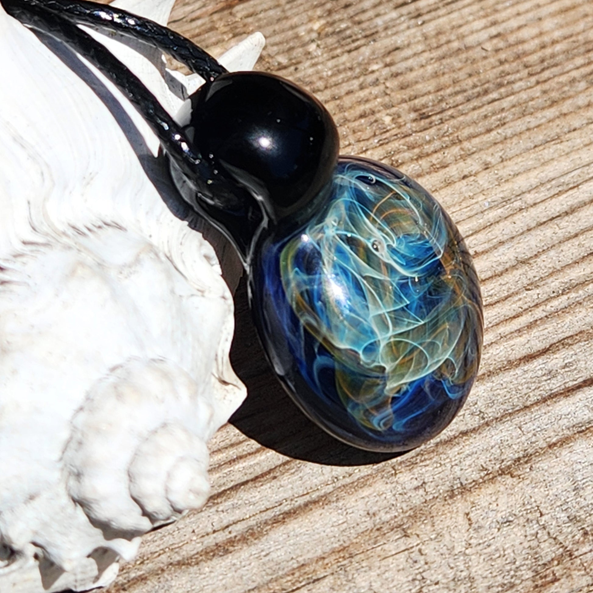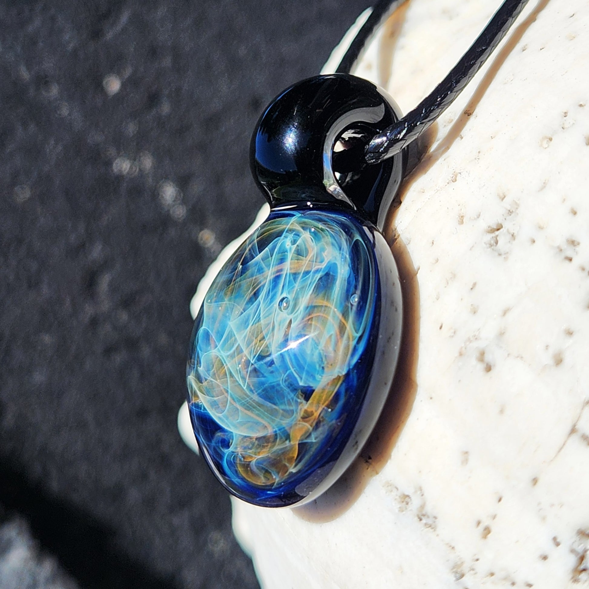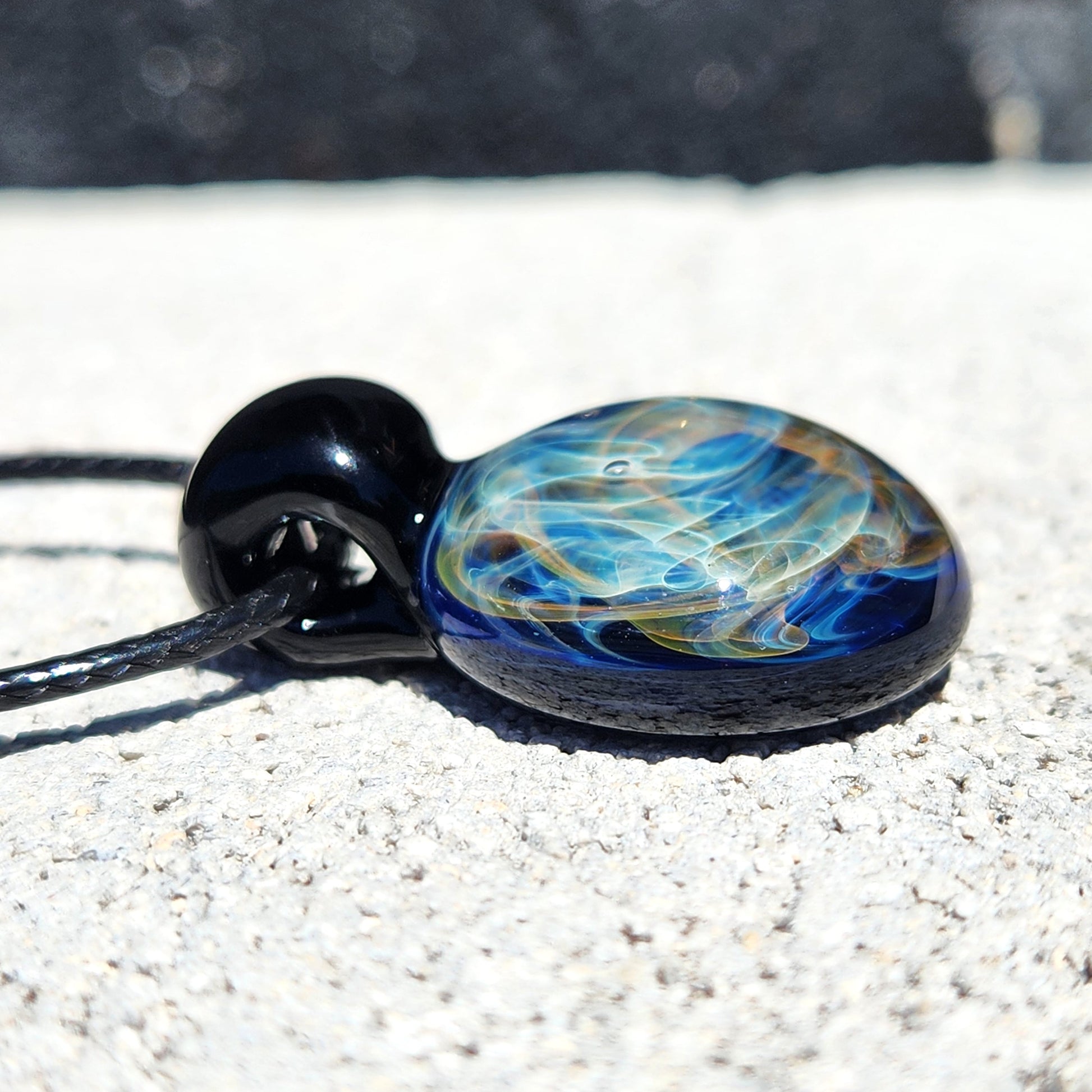 This handmade glass pendant measures just under 1 inch wide (0.95") by 1.4" long, making it a delicate yet striking piece of wearable art. Layers of pure gold and pure silver fuming swirl across a deep midnight-blue background, finished with glossy black glass for added contrast and elegance.