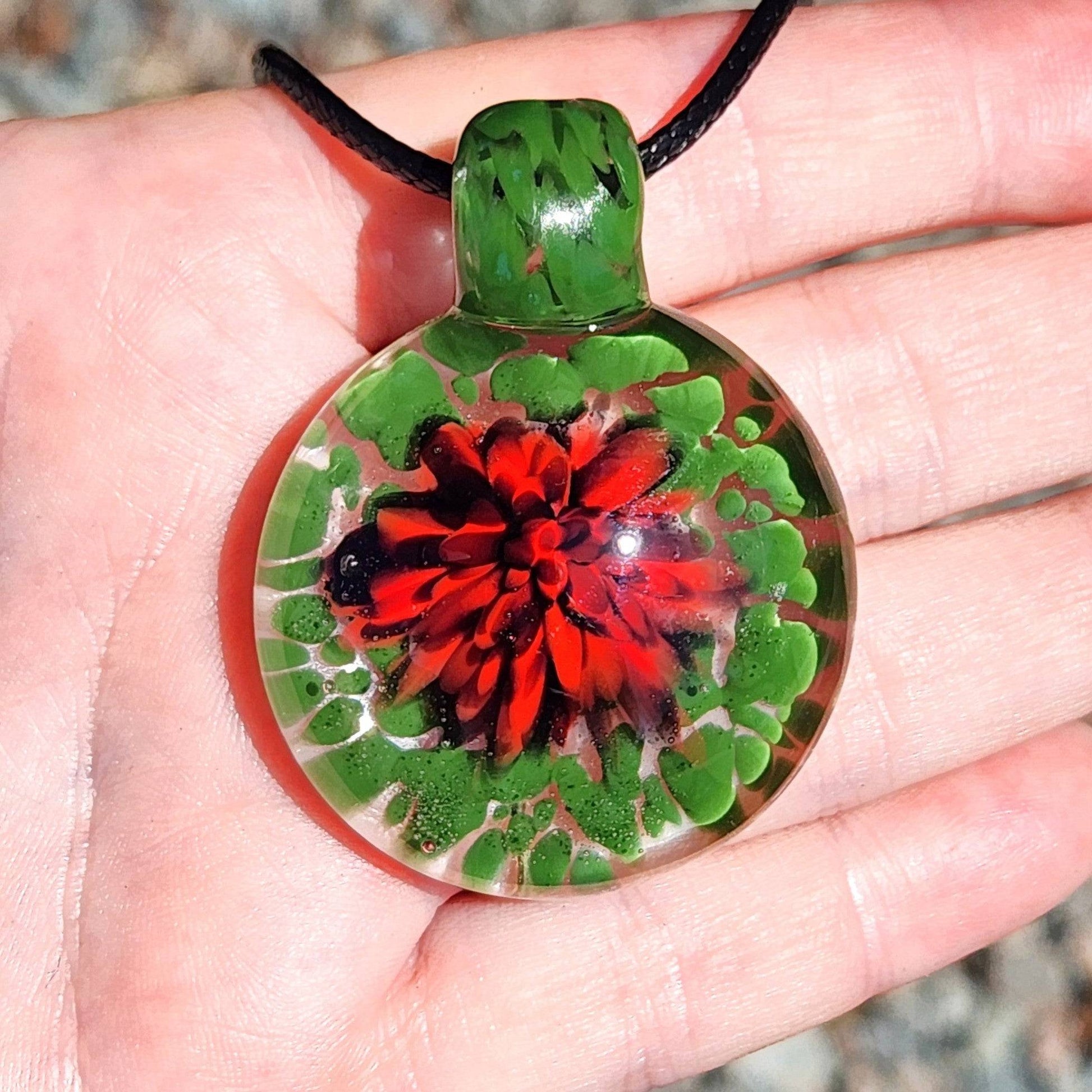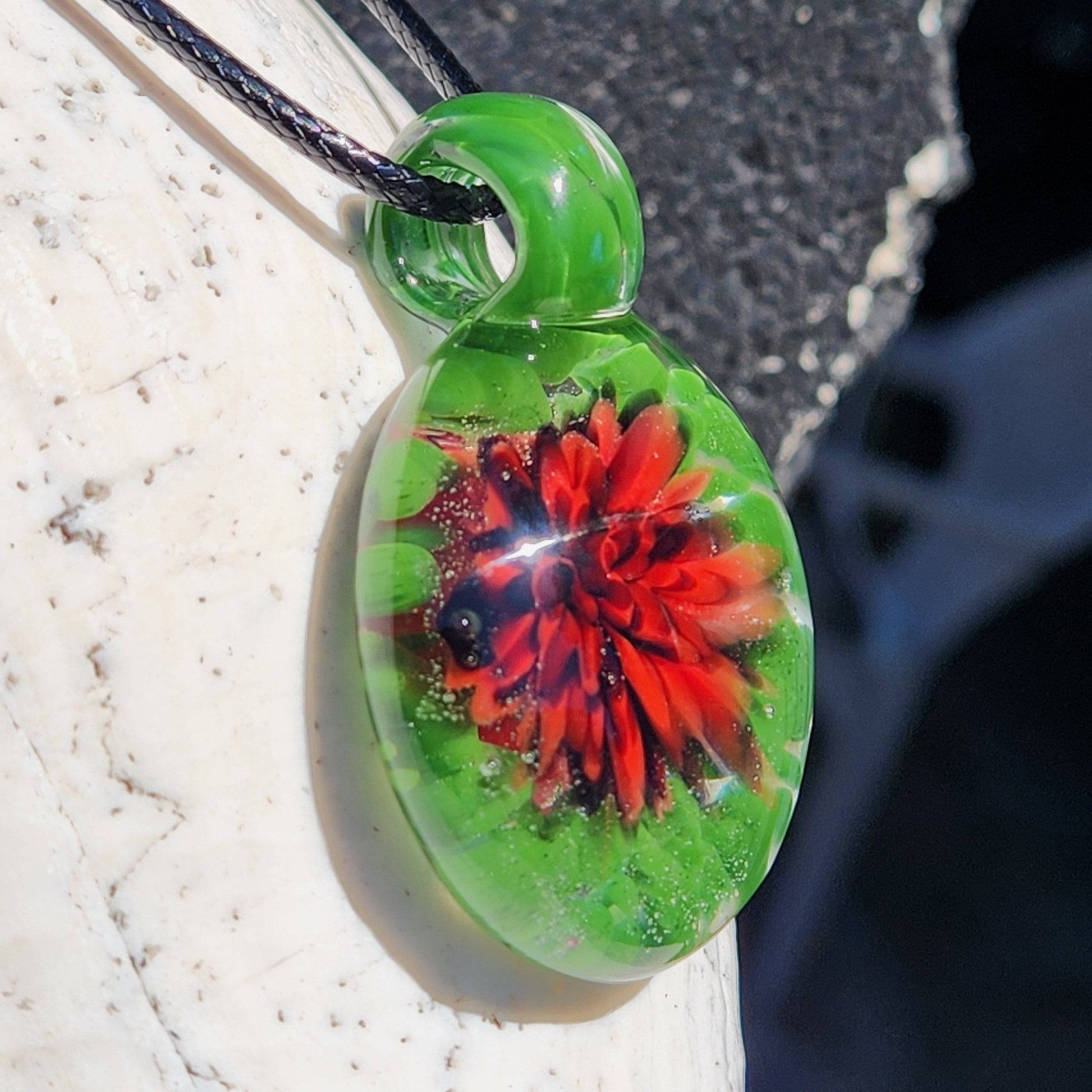 Whether you’re drawn to botanical themes, love funky handmade jewelry, or simply want a one-of-a-kind glass art piece, this pendant brings earthy color and fiery energy to your look.