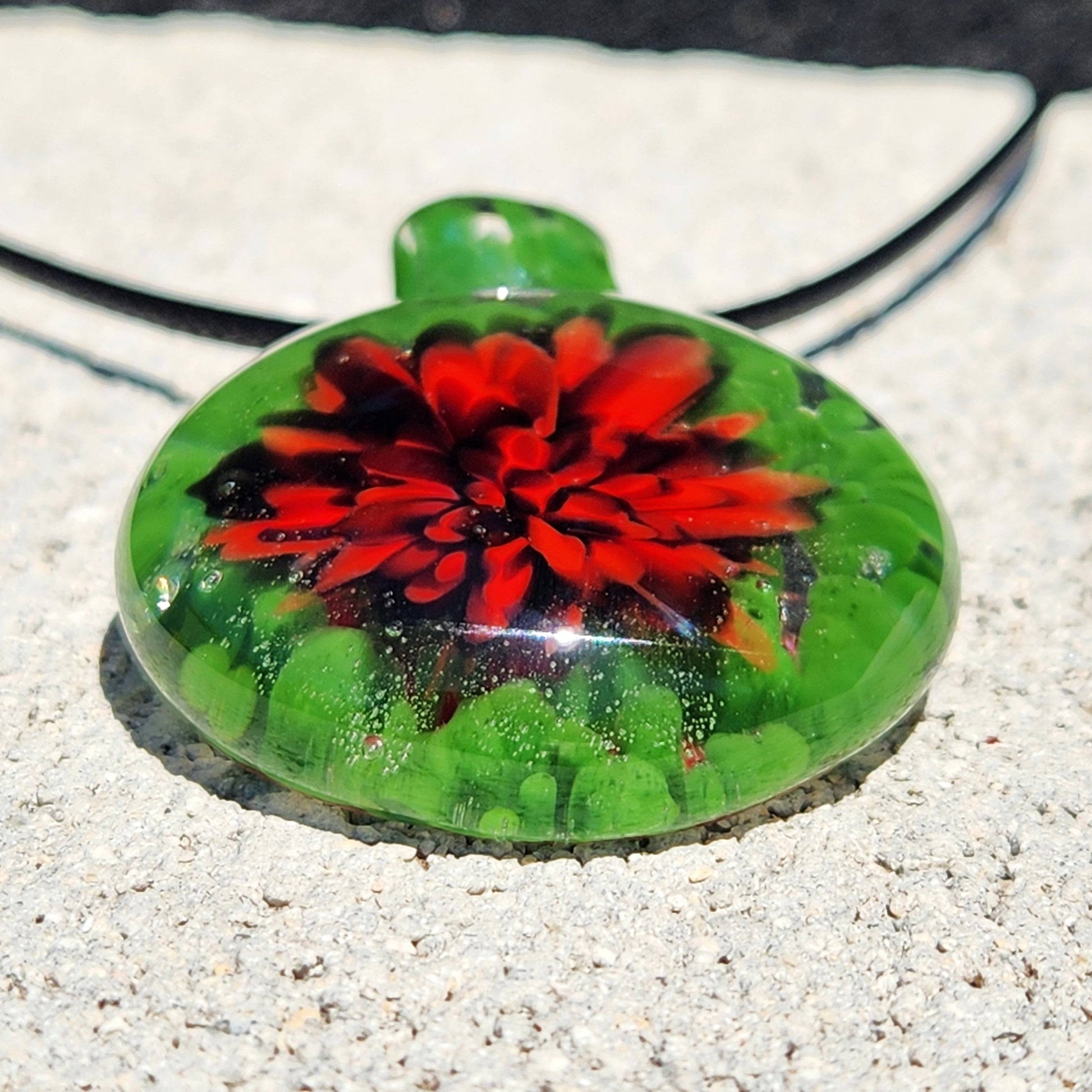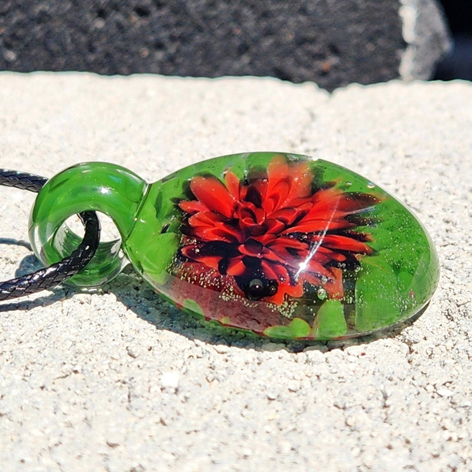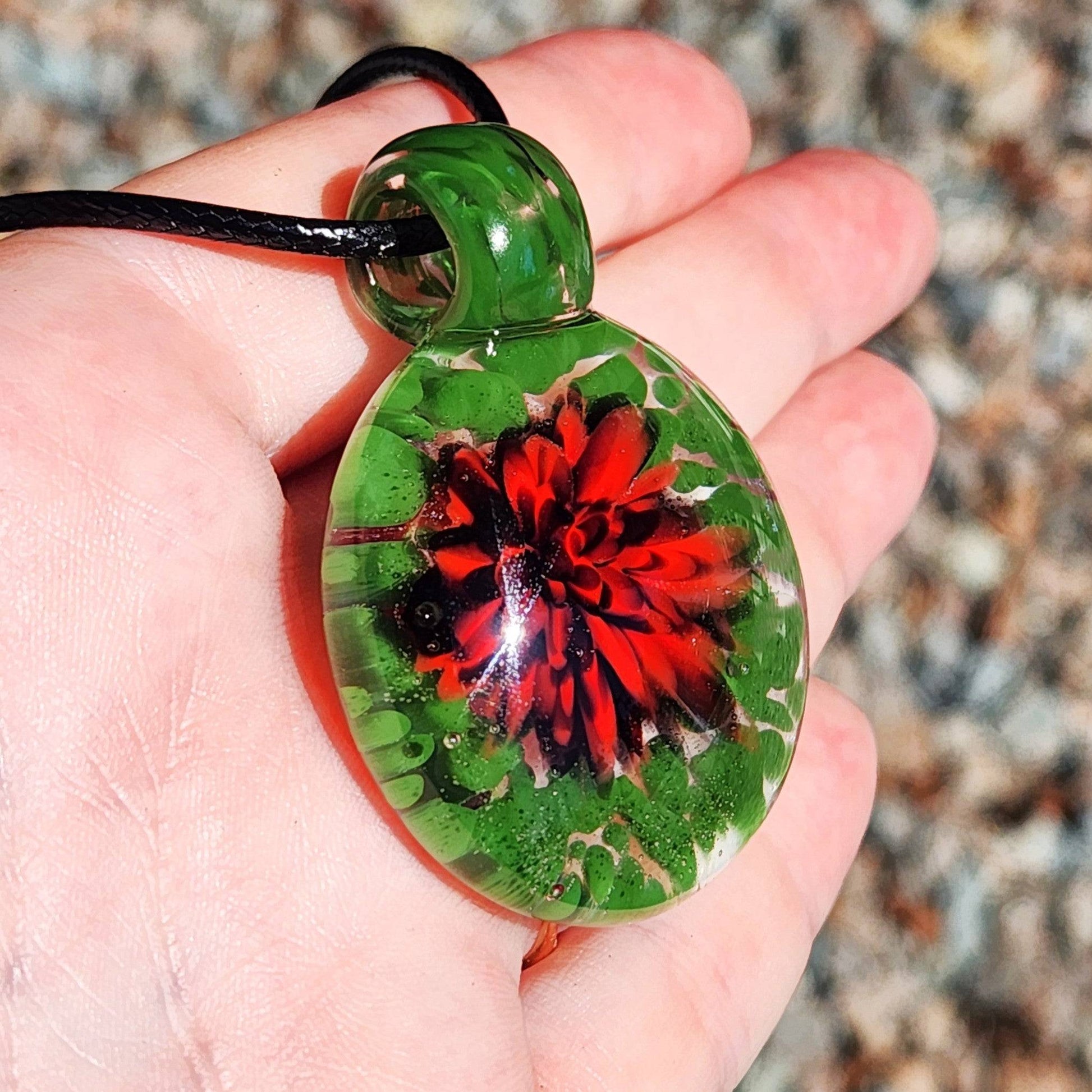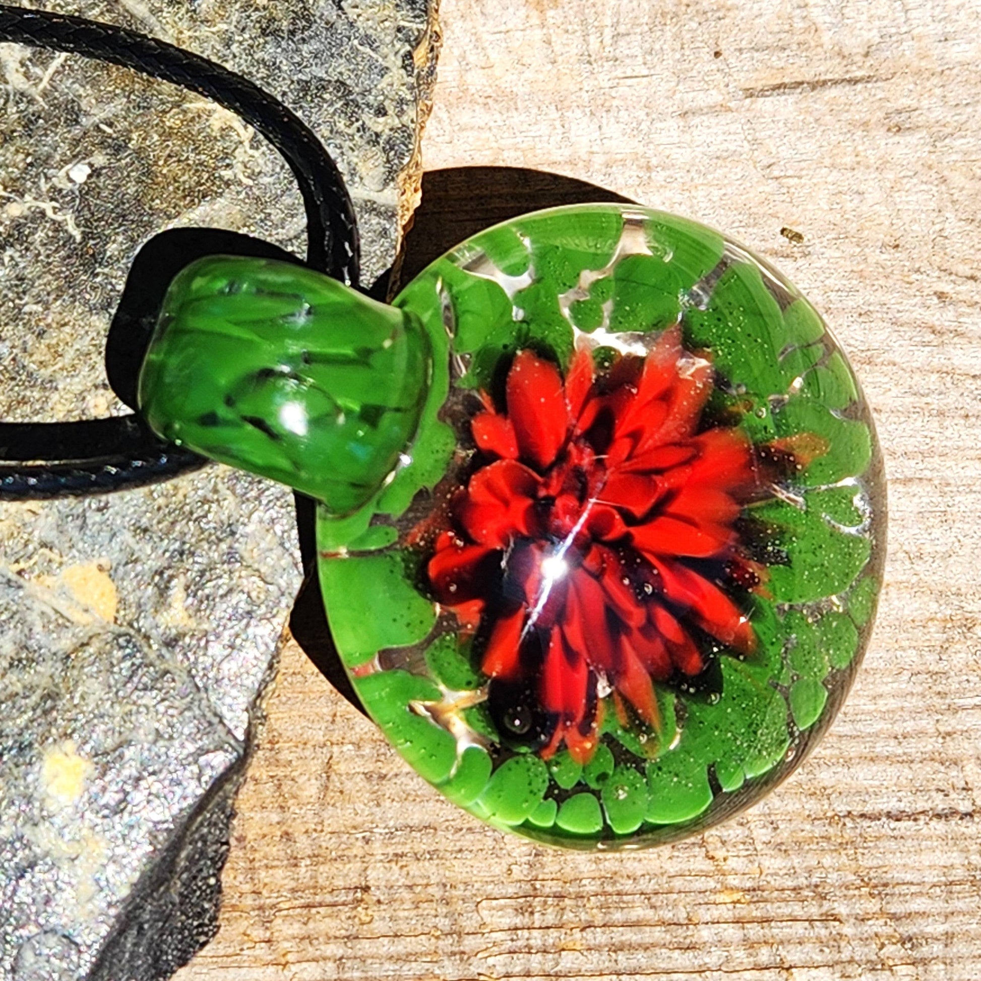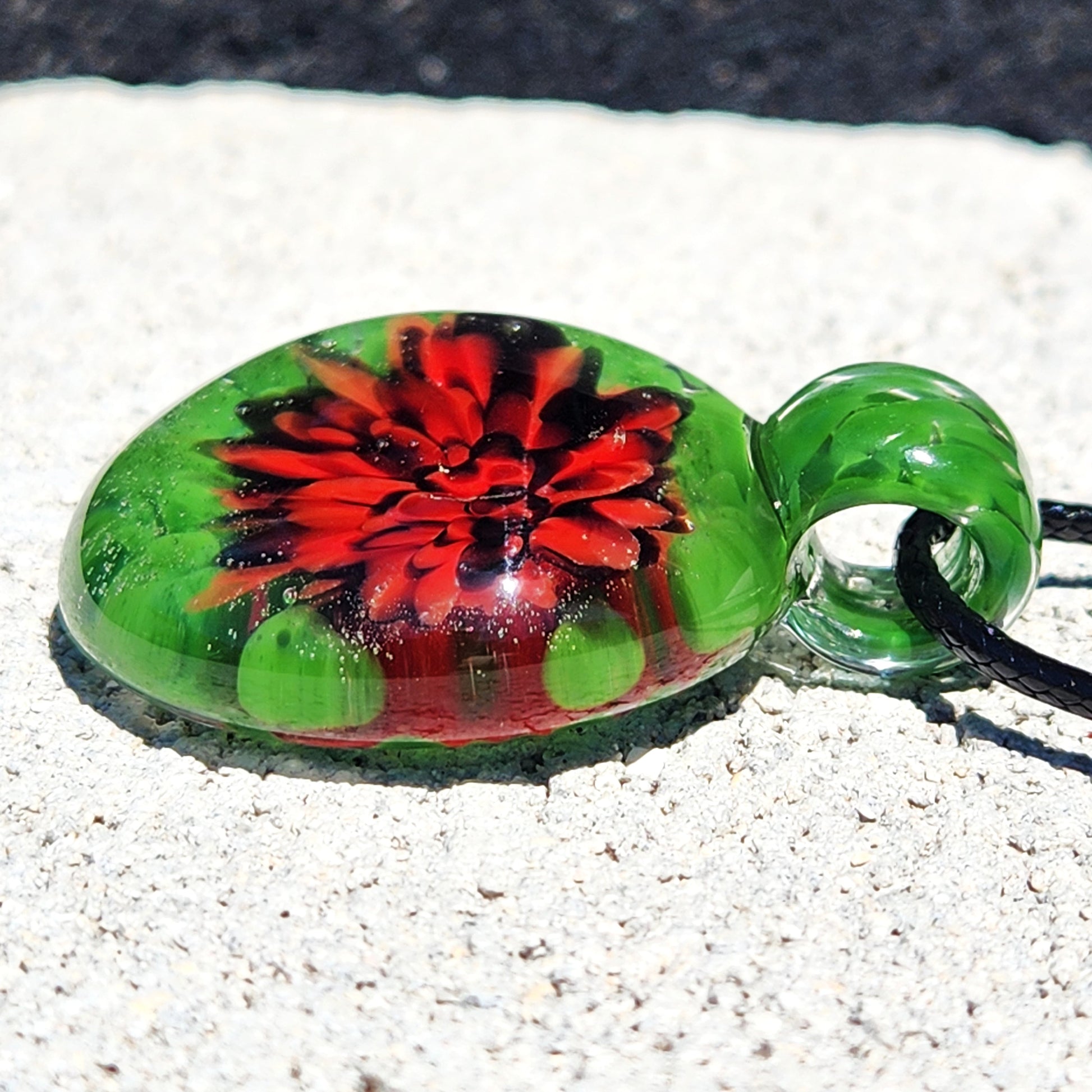 Bold Red Flower on Green - Handmade Blown Glass Pendant