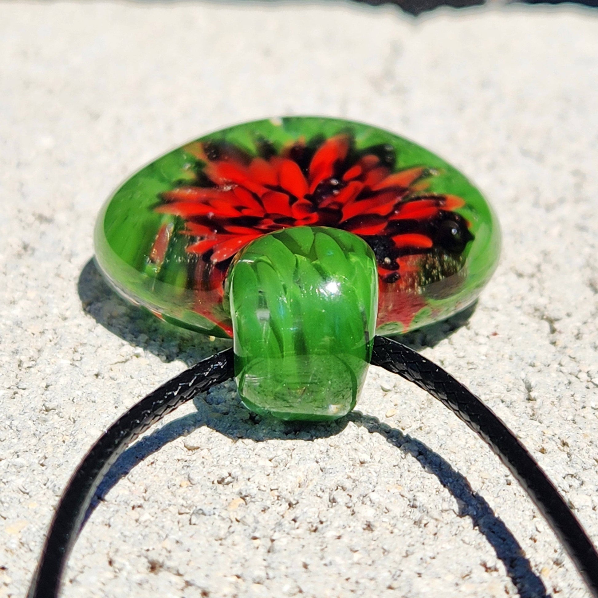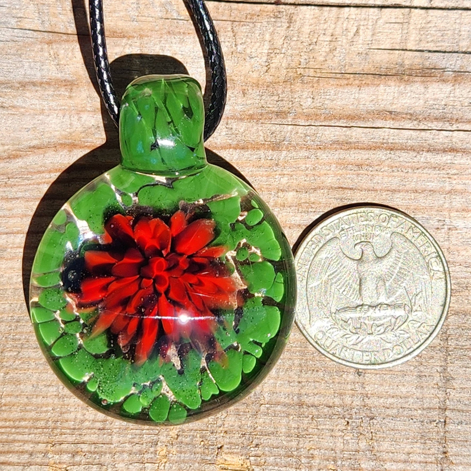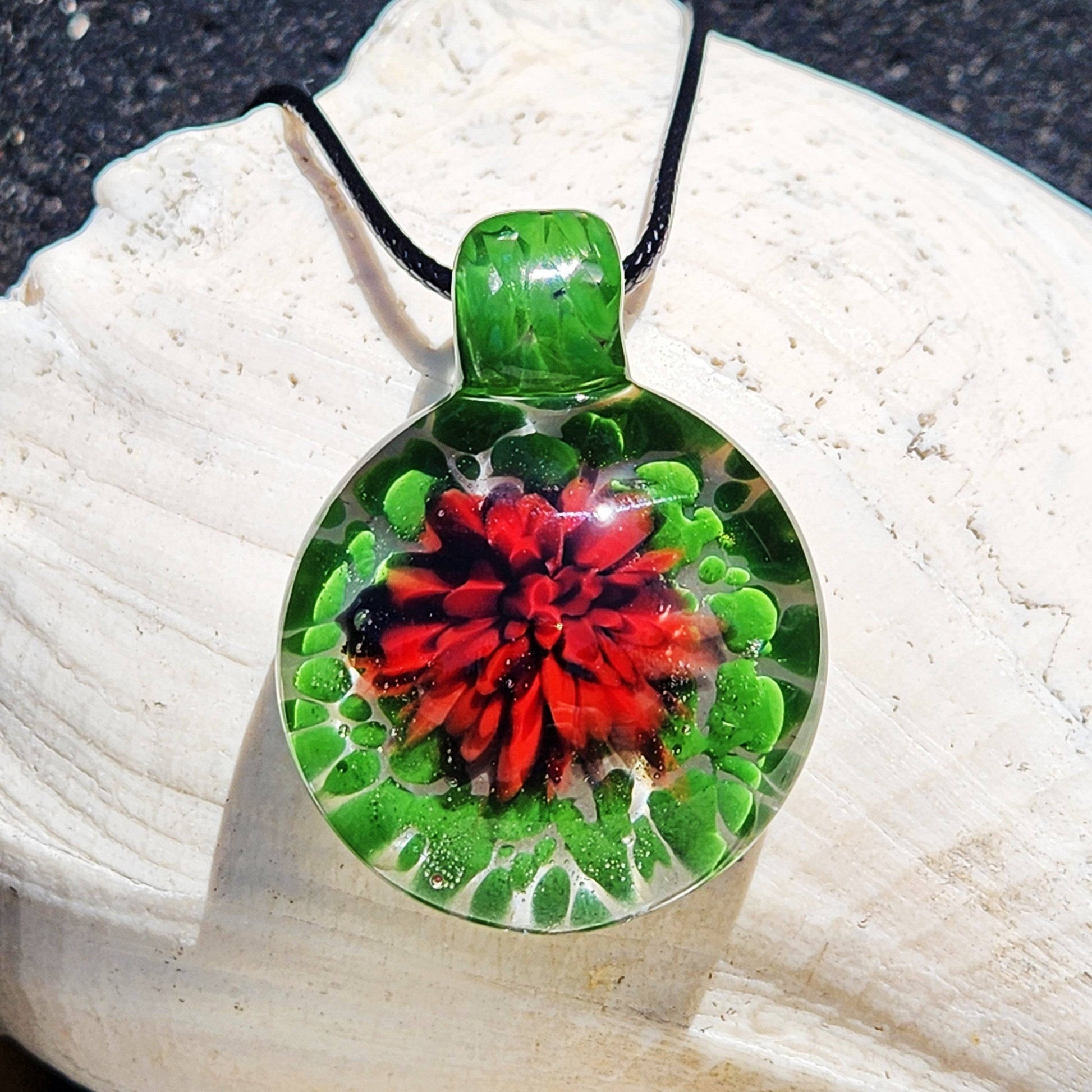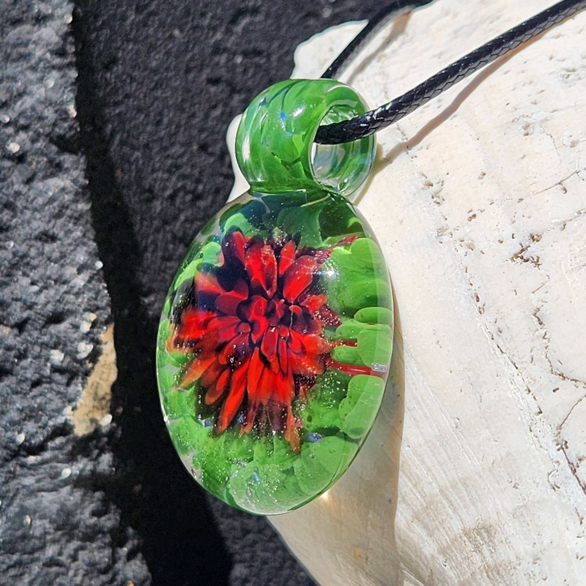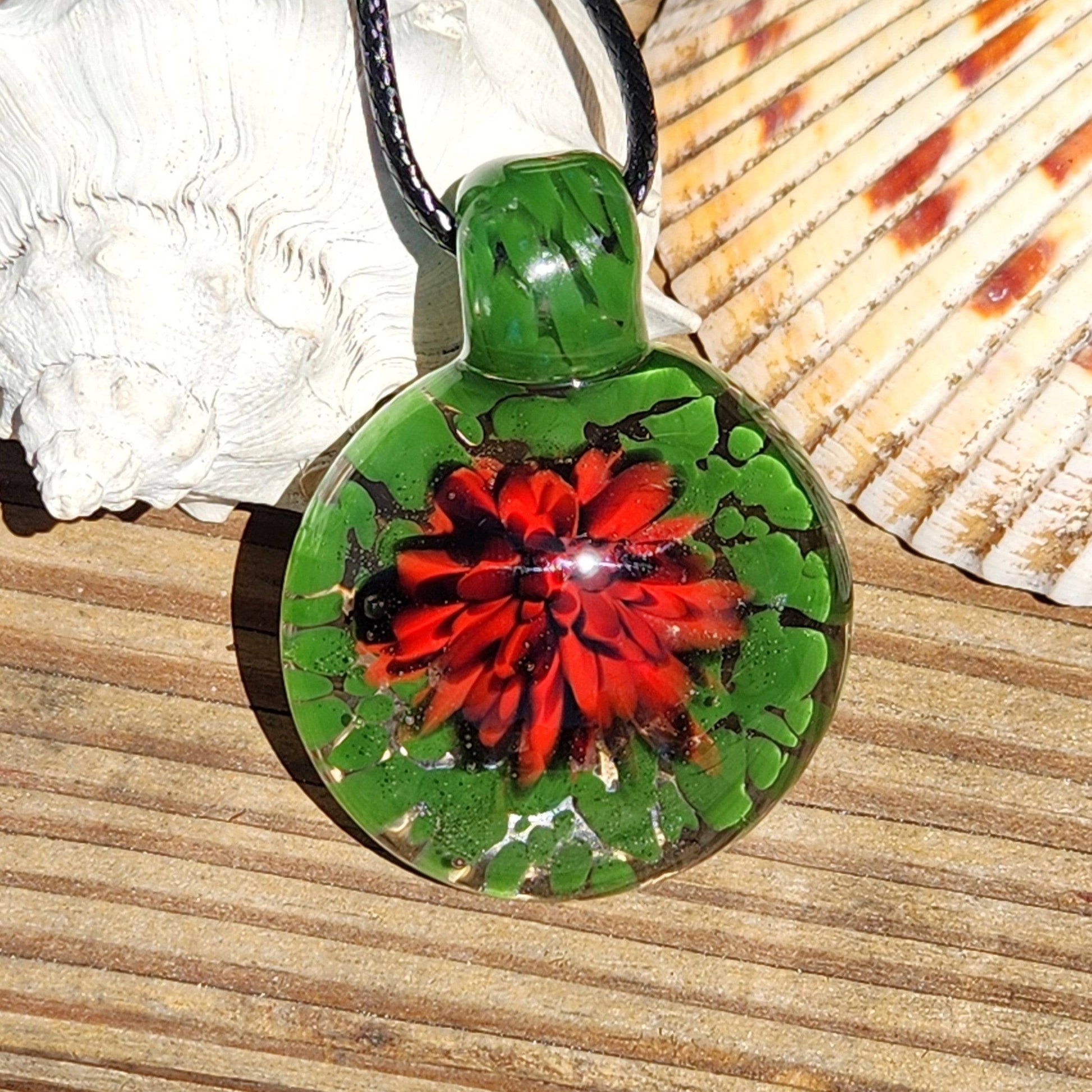 Bold Red Flower on Green - Handmade Blown Glass Pendant