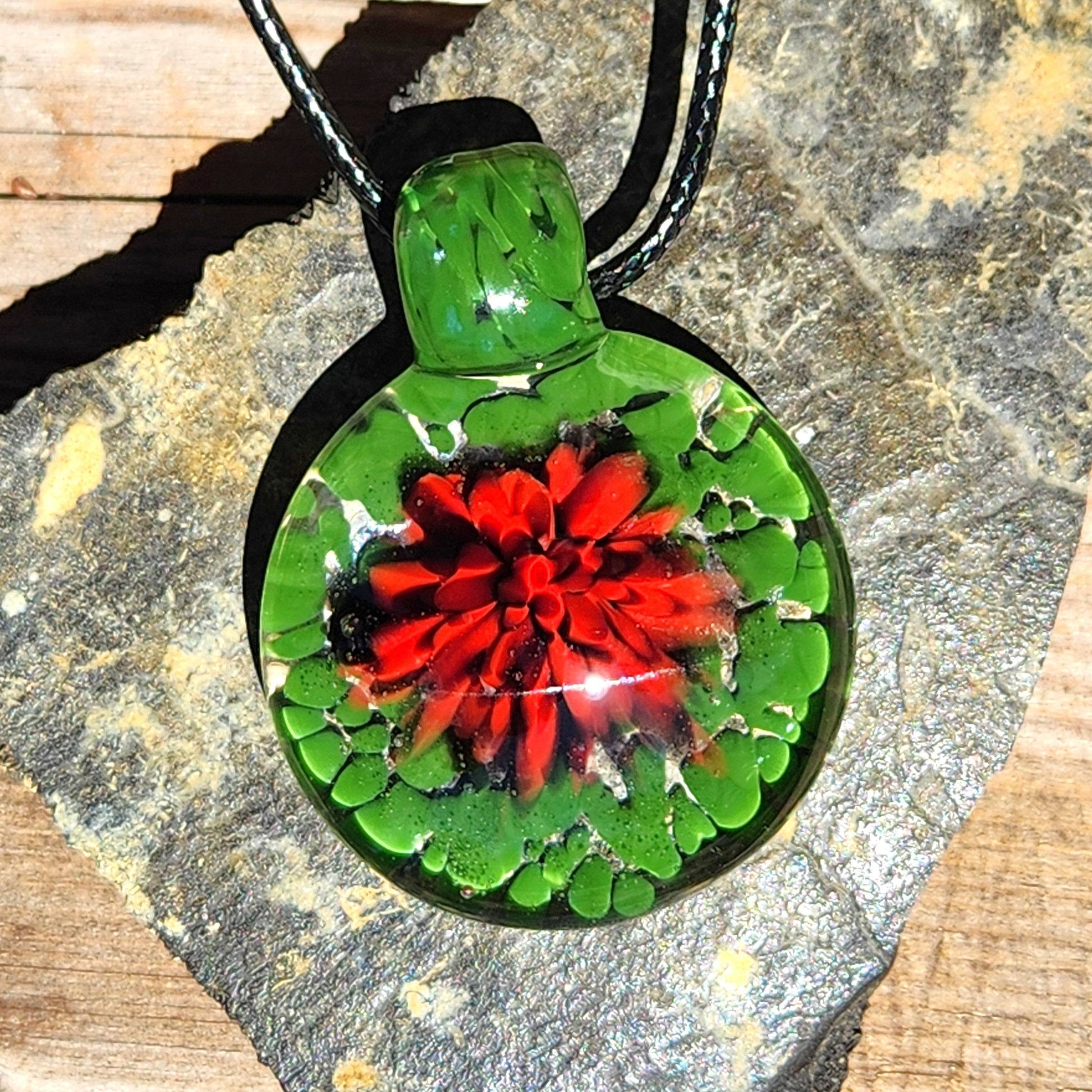 Celebrate the vivid beauty of nature with this bold handmade glass pendant featuring a radiant red flower blooming against a vibrant green background. Made with care in our Florida studio, this glass pendant blends botanical inspiration with heady glass holiday vibes.