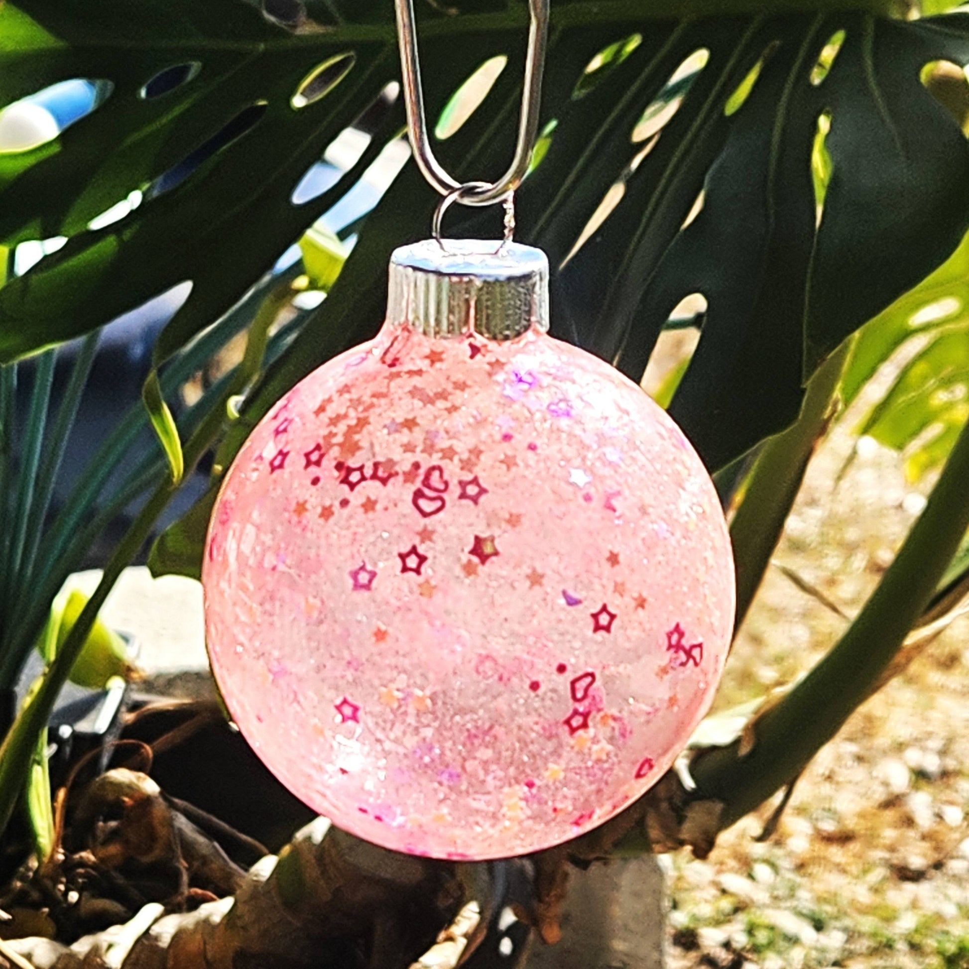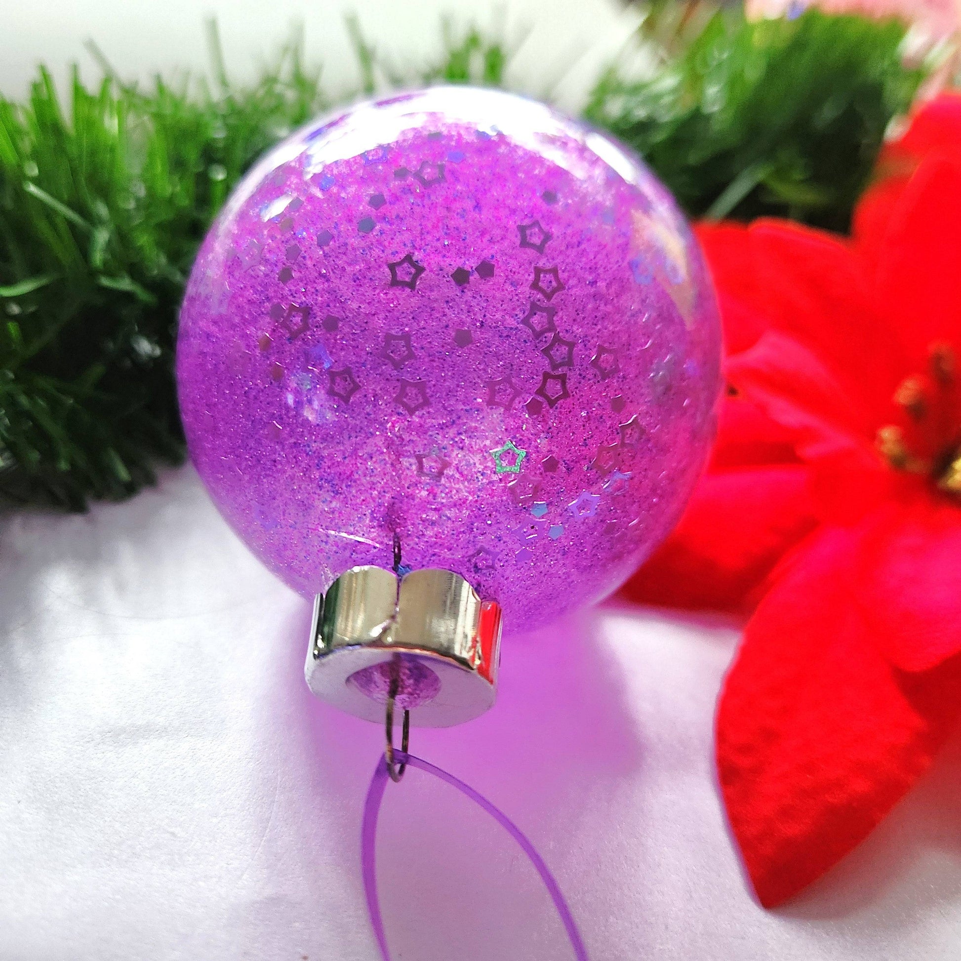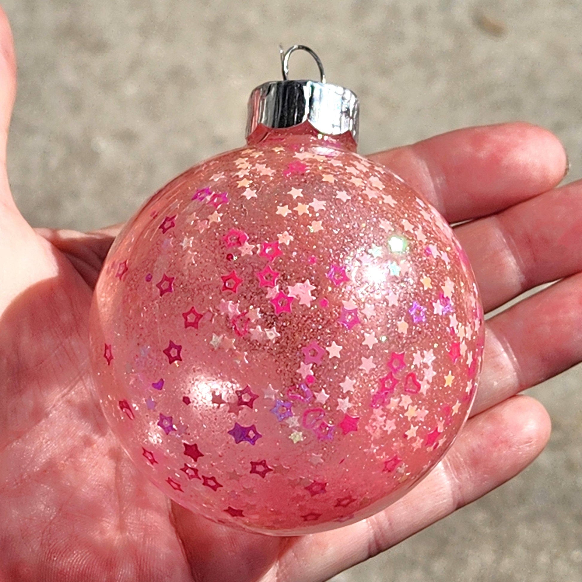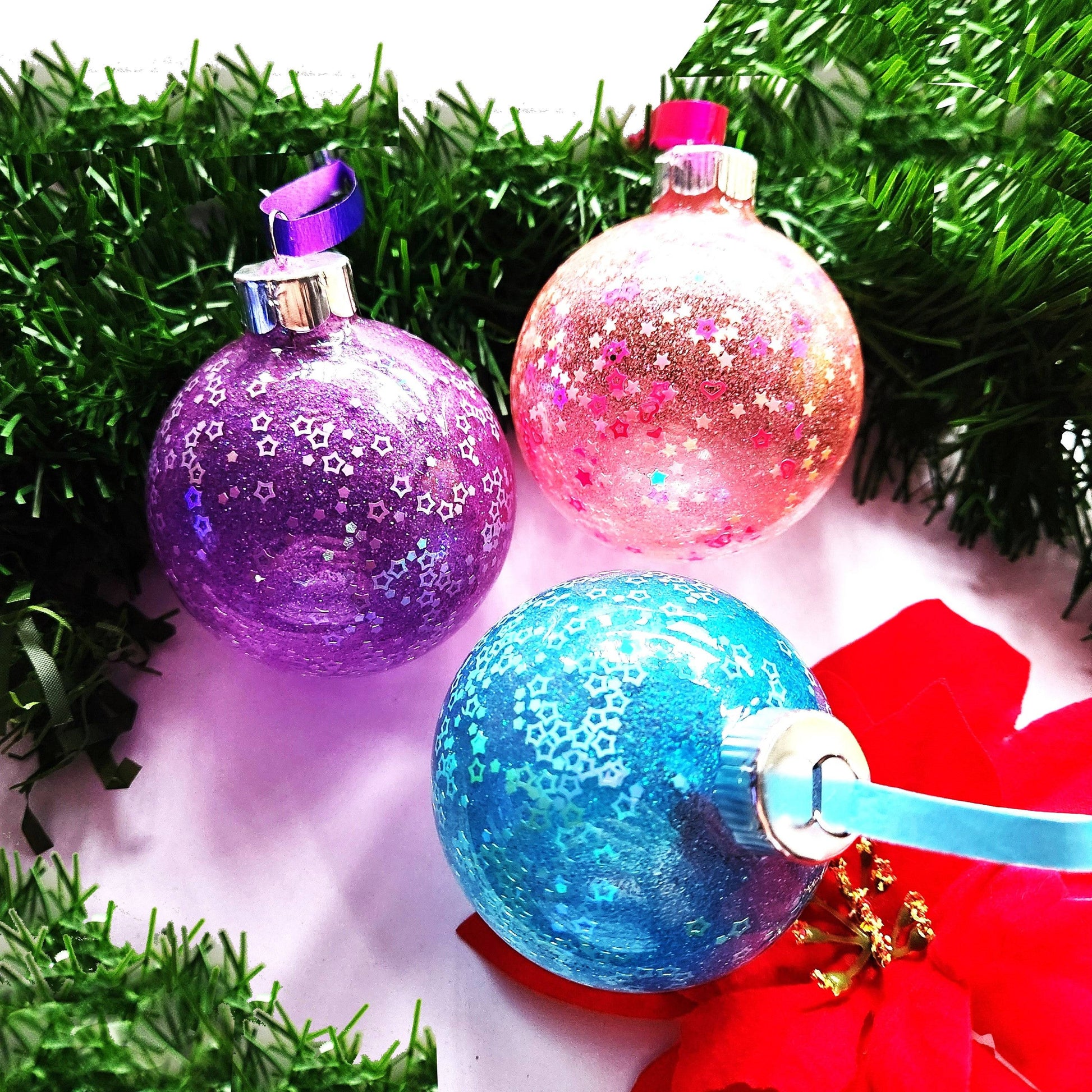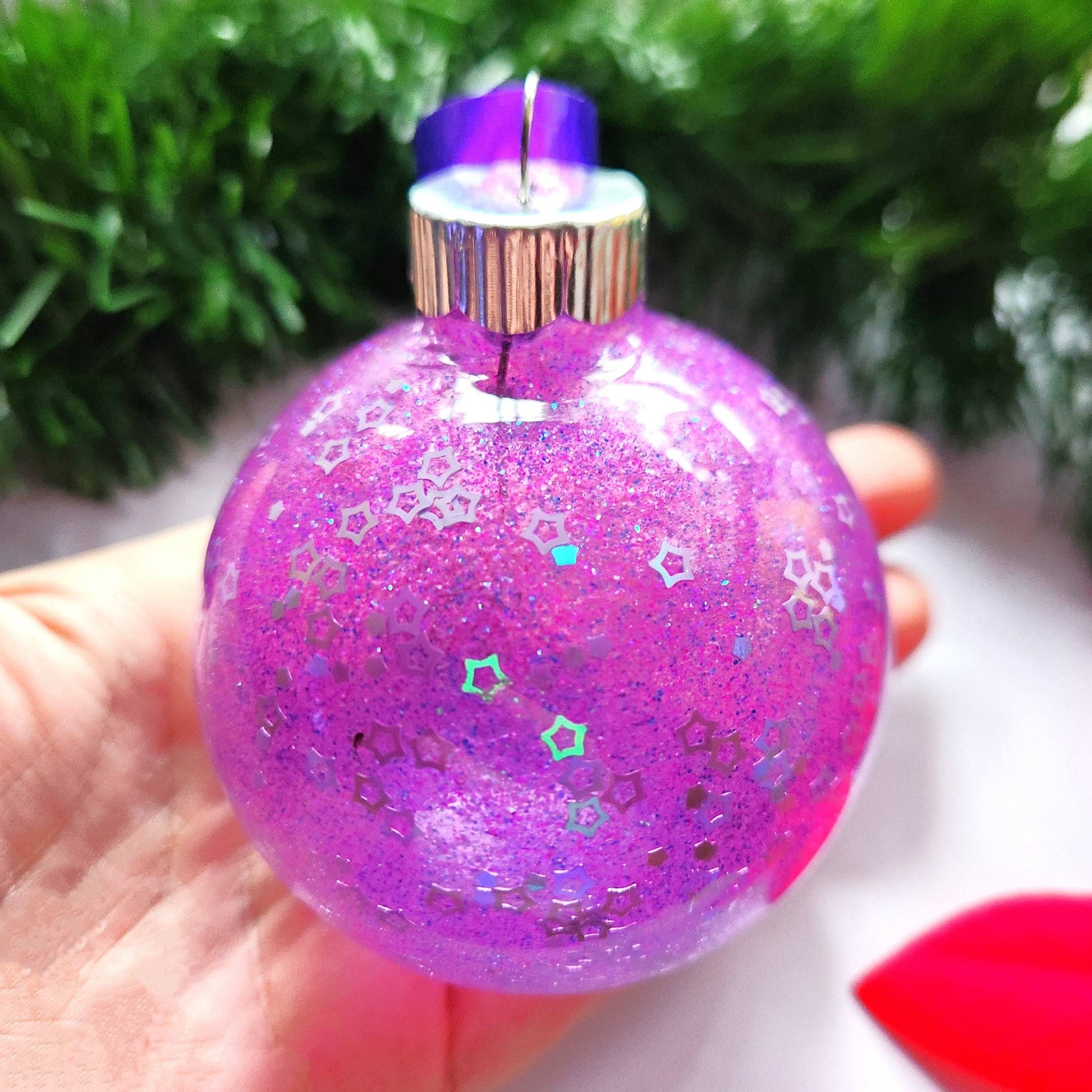 Bring a shimmering touch of elegance to your holiday celebrations with this handmade glass Christmas ornament. Perfect for adding festive charm to your tree, wreath, or mantel, this ornament is a clear glass ball with added glitter and resin, designed to sparkle under holiday lights. Choose from three stunning colors: pink (featuring star-shaped and heart-shaped glitter), blue, or purple (both featuring star-shaped glitter). Each ornament is adorned with a matching ribbon for easy hanging and comes beautifully packaged in a silver gift box, ready for gifting or adding a magical touch to your own holiday decor.