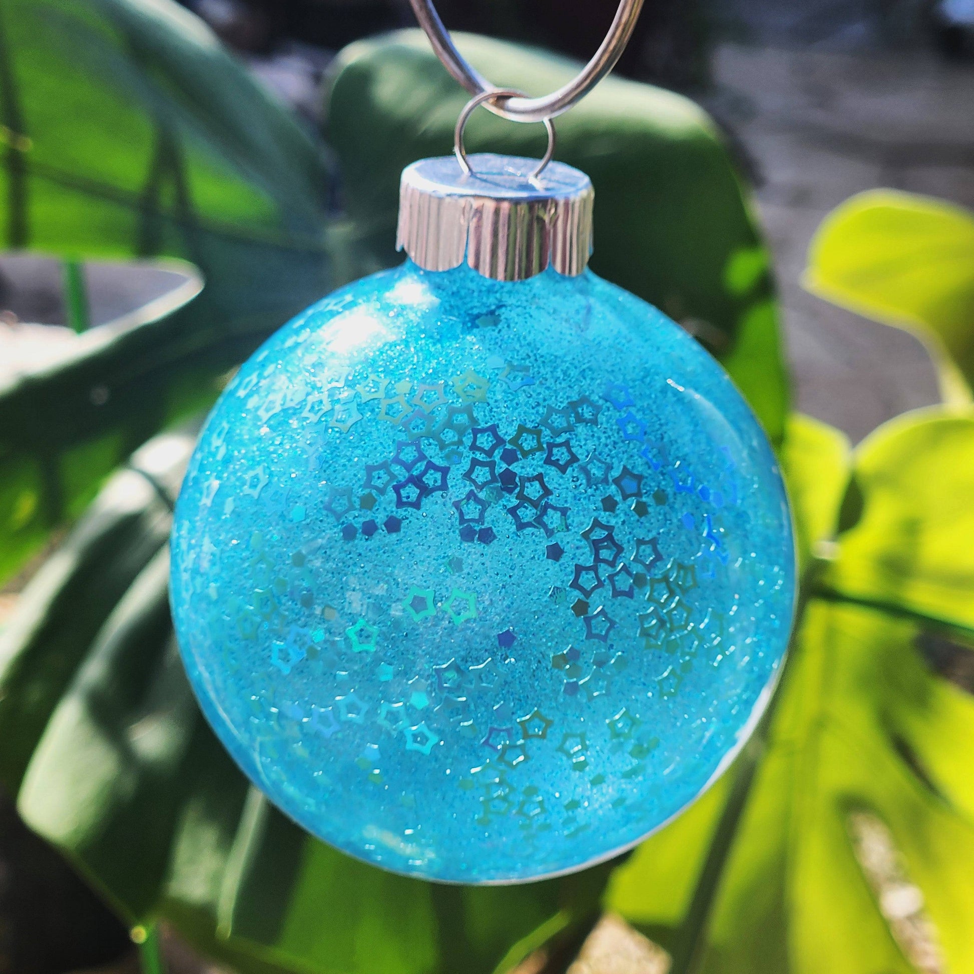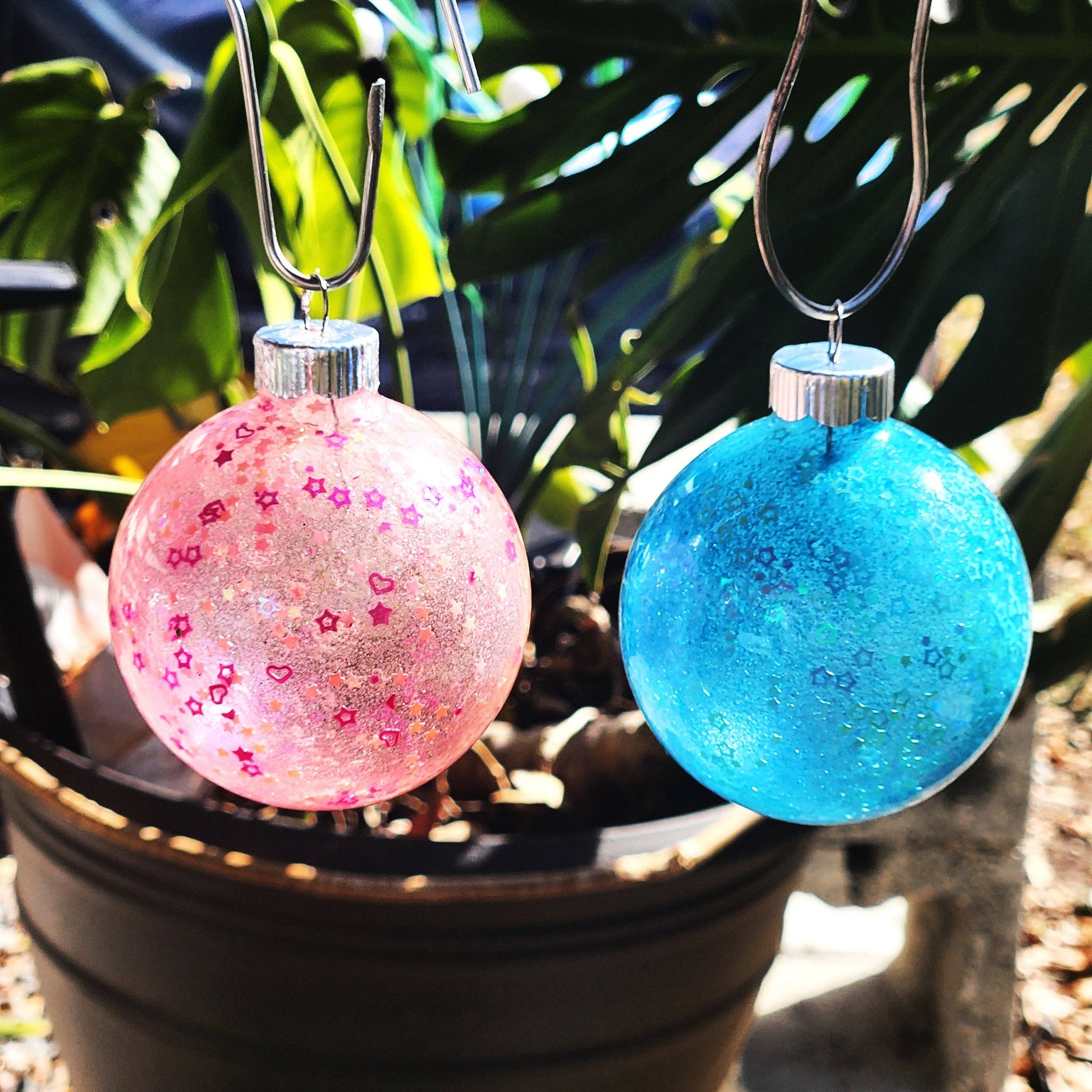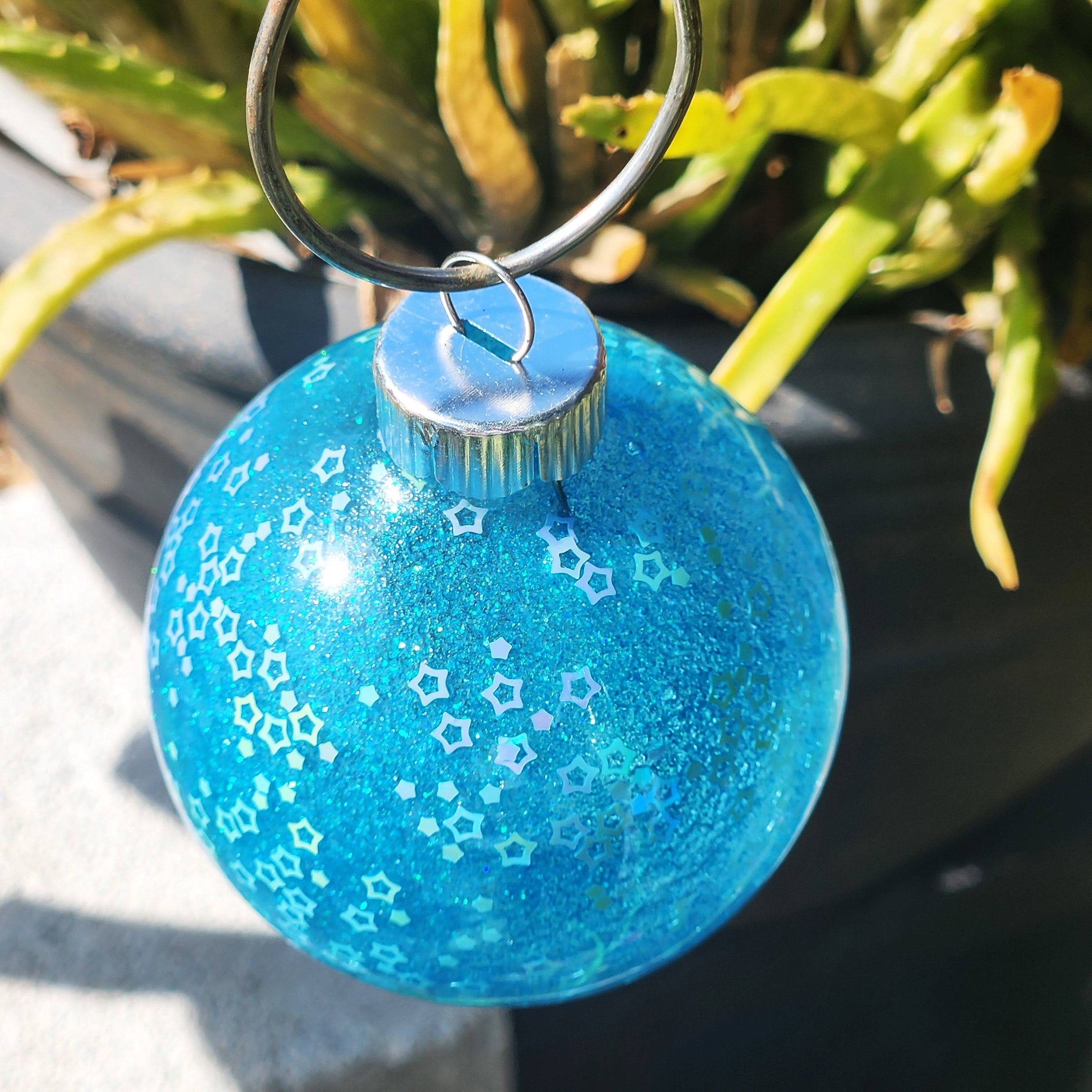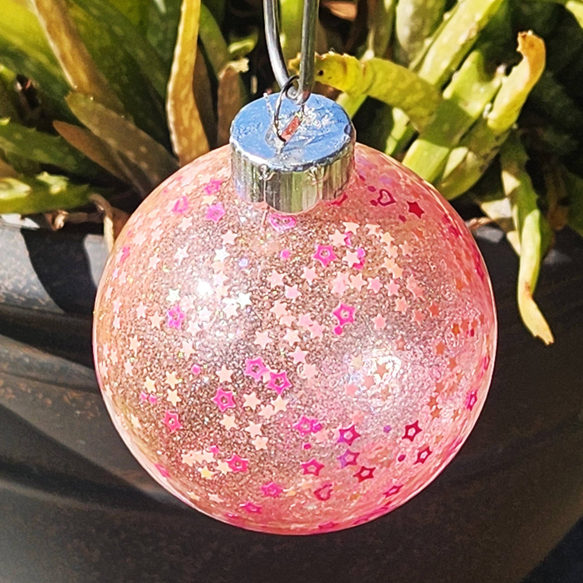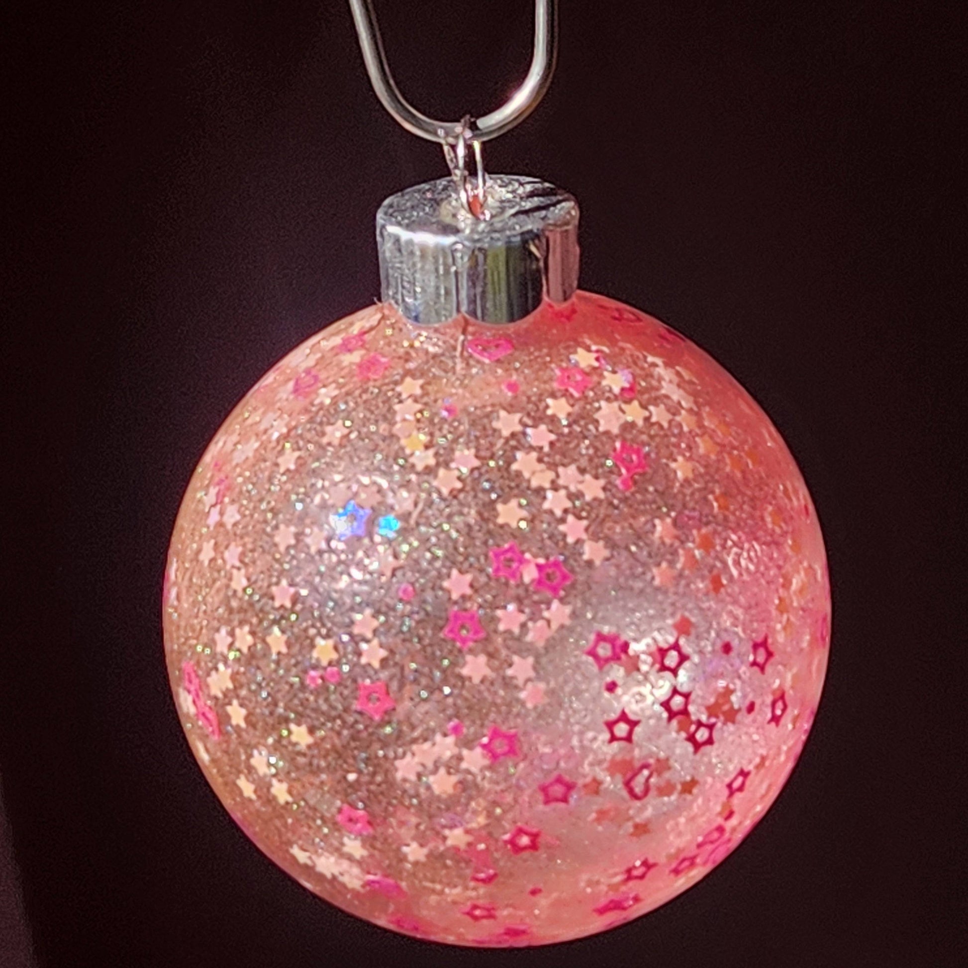 Bring a shimmering touch of elegance to your holiday celebrations with this handmade glass Christmas ornament. Perfect for adding festive charm to your tree, wreath, or mantel, this ornament is a clear glass ball with added glitter and resin, designed to sparkle under holiday lights. Choose from three stunning colors: pink (featuring star-shaped and heart-shaped glitter), blue, or purple (both featuring star-shaped glitter). Each ornament is adorned with a matching ribbon for easy hanging and comes beautifully packaged in a silver gift box, ready for gifting or adding a magical touch to your own holiday decor.