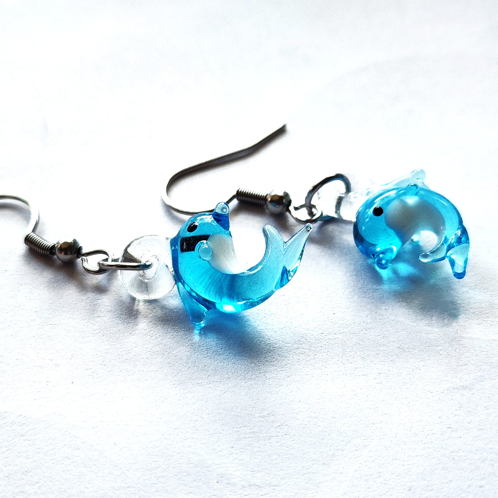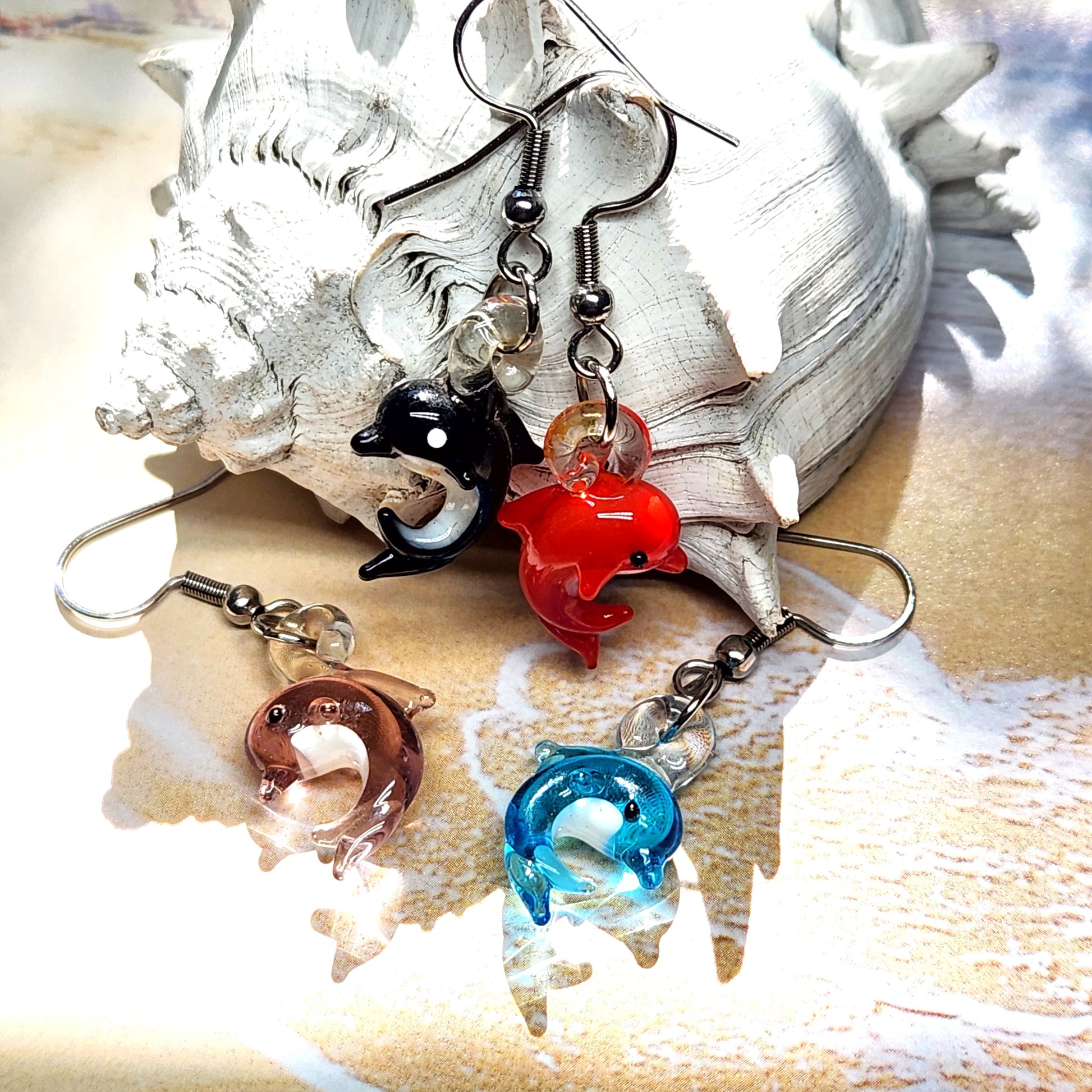 Each dolphin is handmade by a guest glass artist and carefully assembled with durable stainless steel hardware for long-lasting wear. Because every piece is individually crafted, slight variations in size, color, and detail make each pair unique.