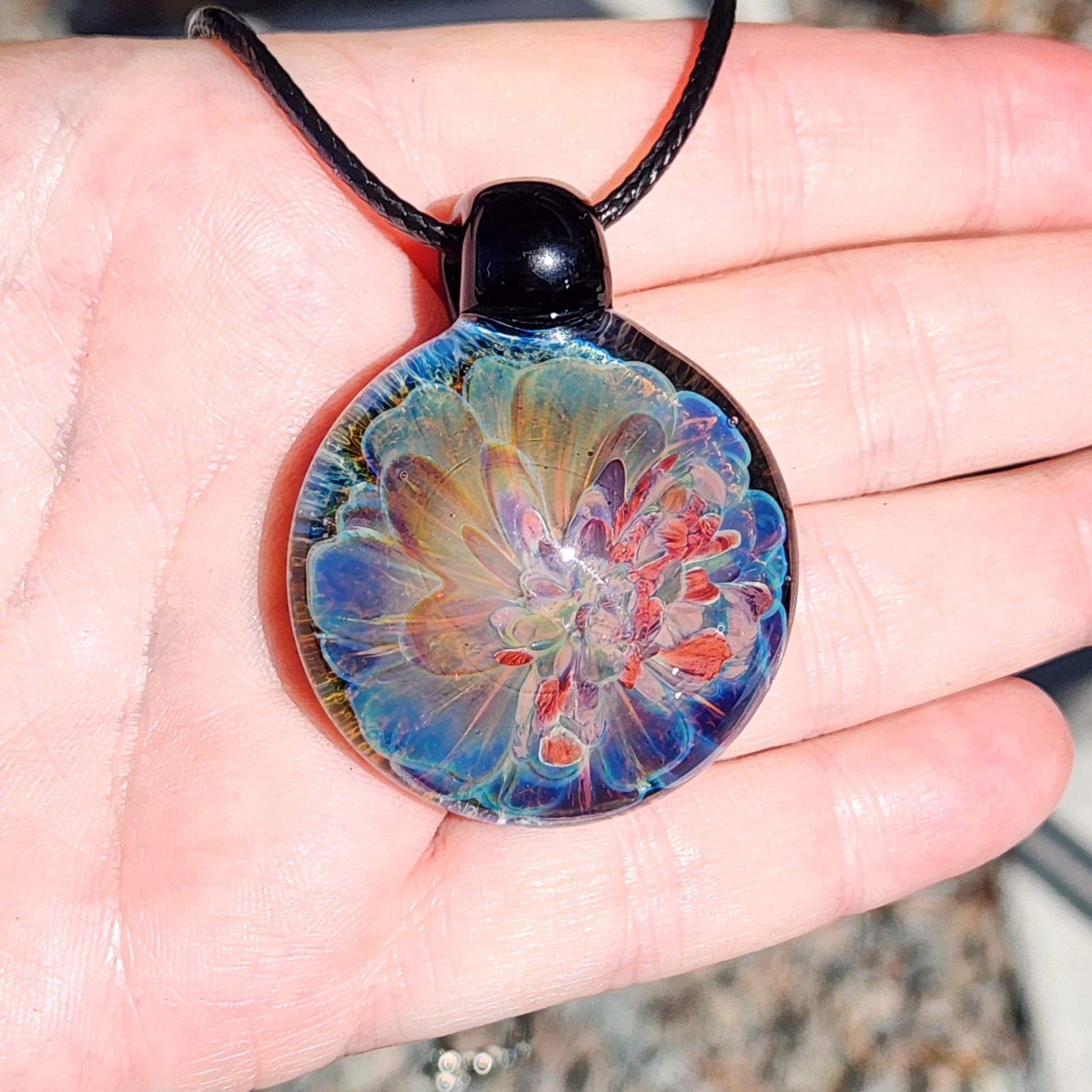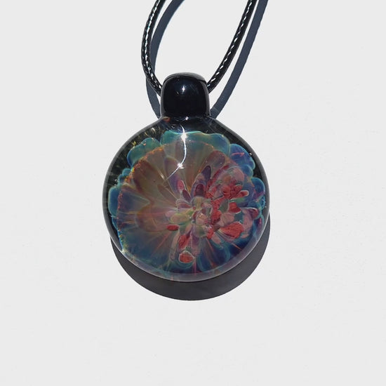 This handmade blown glass pendant is a funky and vibrant statement piece. One side blooms with vivid color, while the other shifts into softer tones, giving the pendant a unique “split personality” design. Crafted with layers of molten borosilicate glass, it creates a mesmerizing flower-like pattern full of depth and light play.